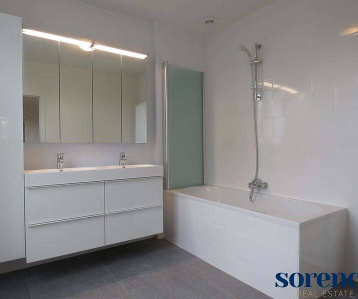 Ingerichte BADKAMER: grijze tegels - ligbad/douche - dubbele wastafel in een meubel.