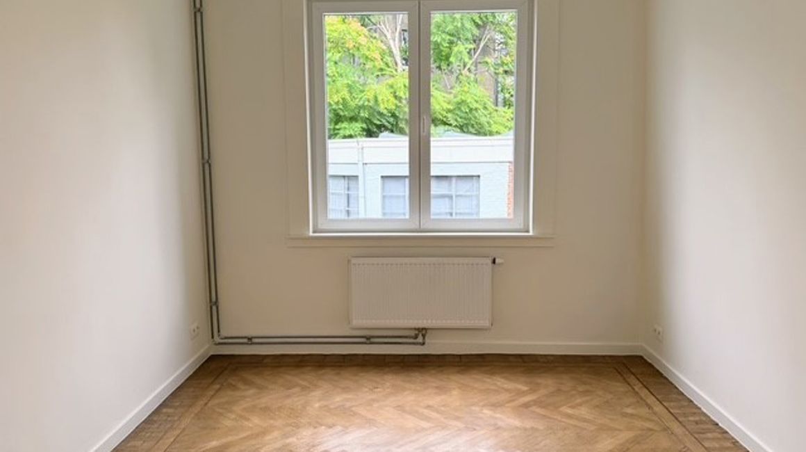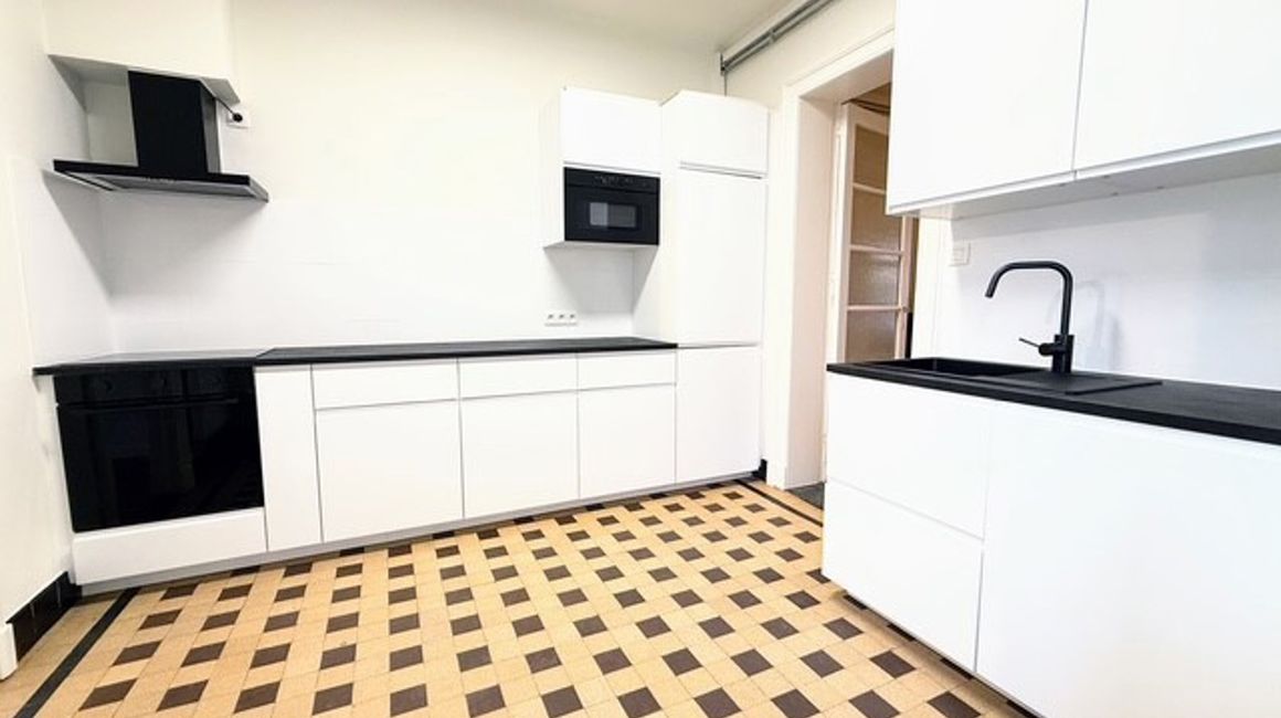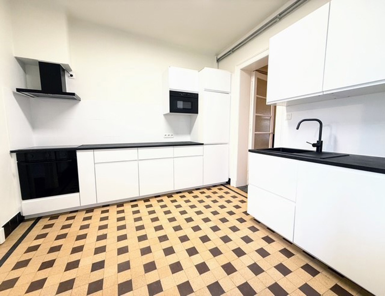 De volledig nieuwe keuken van ca. 3,26m x 3m is uitgerust met moderne toestellen, waaronder een inductiekookplaat, twee ovens, een koelkast met diepvries, een vaatwasser en ruime opbergruimte. De keukenvloer is afgewerkt met zwart-witte tegels. Achteraan het appartement ligt de rustige slaapkamer van ca. 4m x 3m, eveneens met parketvloer.