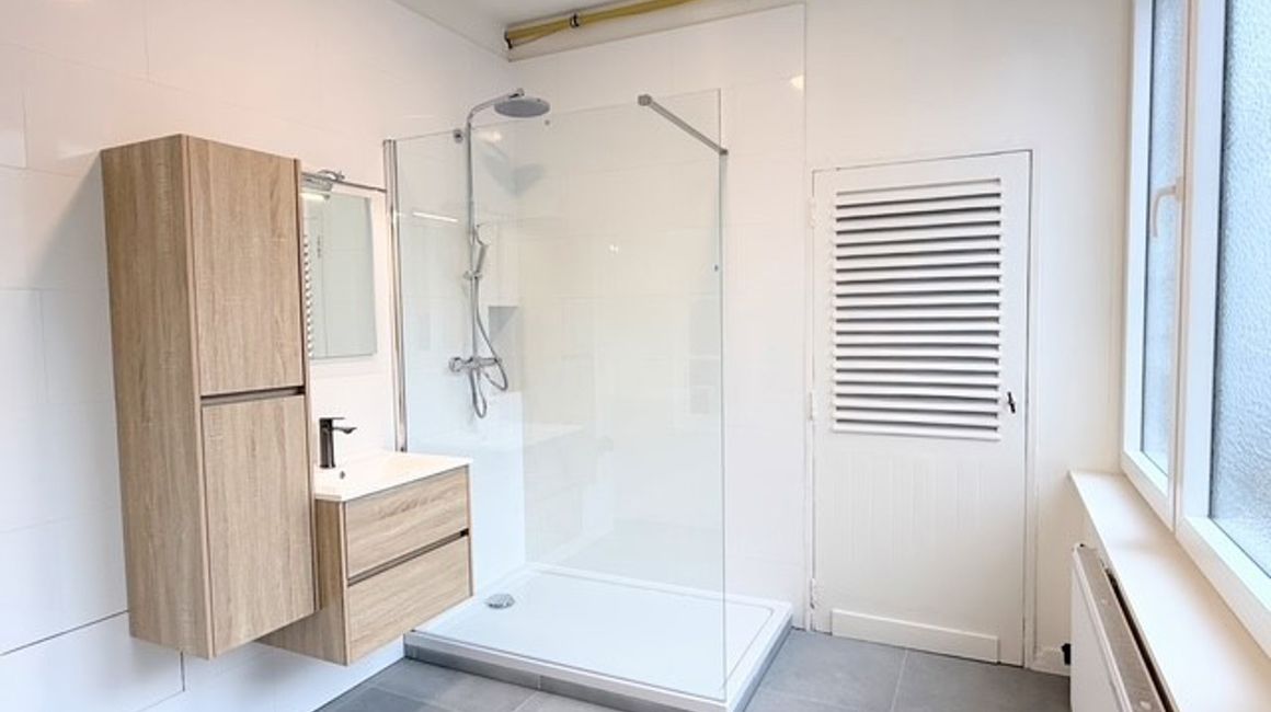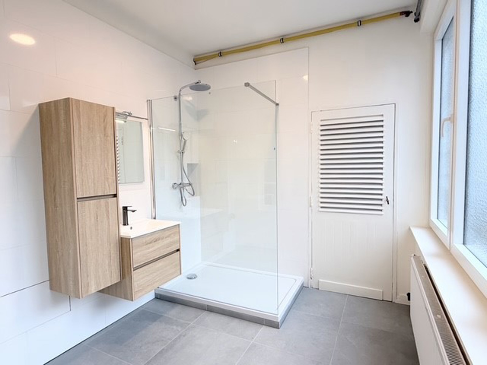 De vernieuwde badkamer van ca. 3m x 2,62m beschikt over een inloopdouche, een lavabo in een kastmeubel en een aansluiting voor de wasmachine. Het appartement heeft daarnaast een apart toilet.