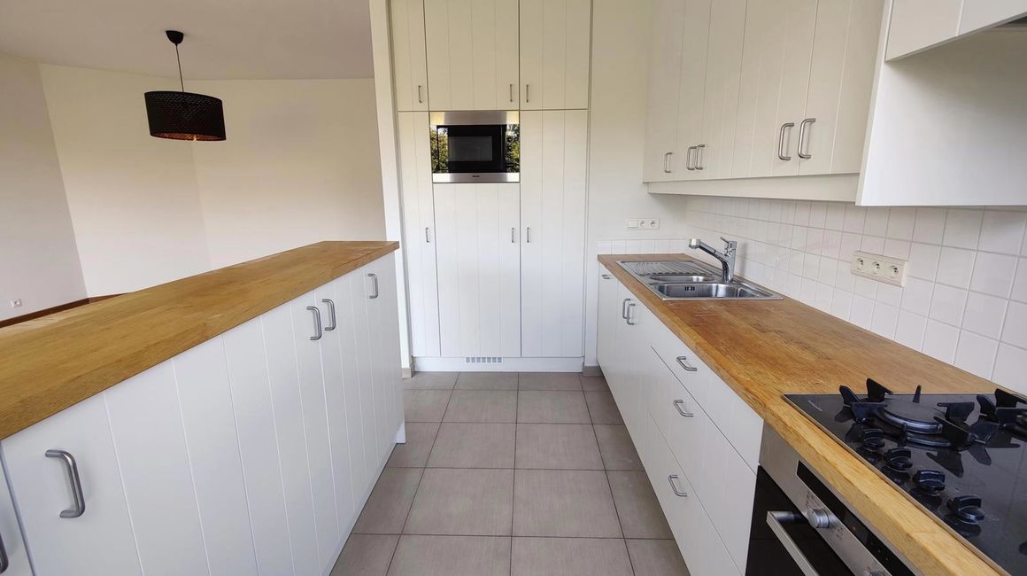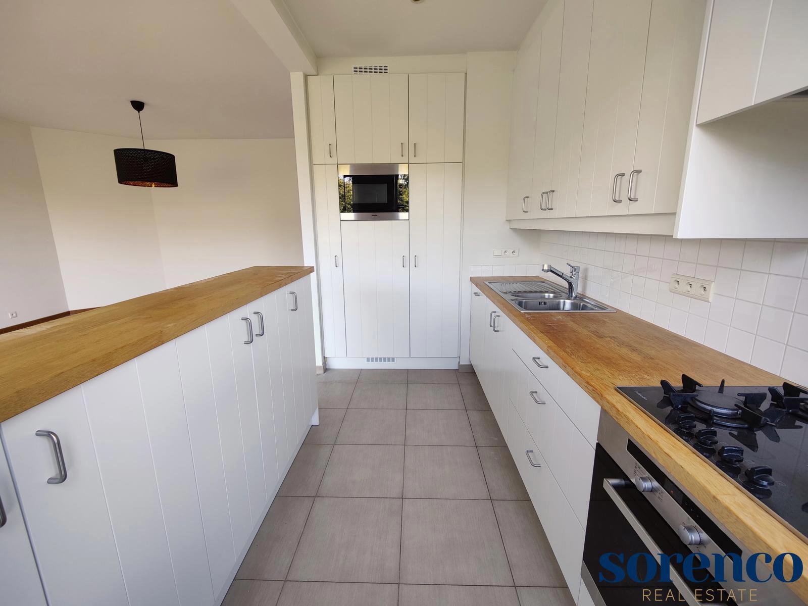 Aangename en lichte LEEFRUIMTE ca. 4,5m x 6,85m op parket, open ingerichte KEUKEN ca. 2,13m x 4,6m voorzien van alle toestellen: microgolf en oven, afwasmachine, gasvuur, dampkap, ijskast met diepvriesvak, spoelbak en voldoende opbergkasten