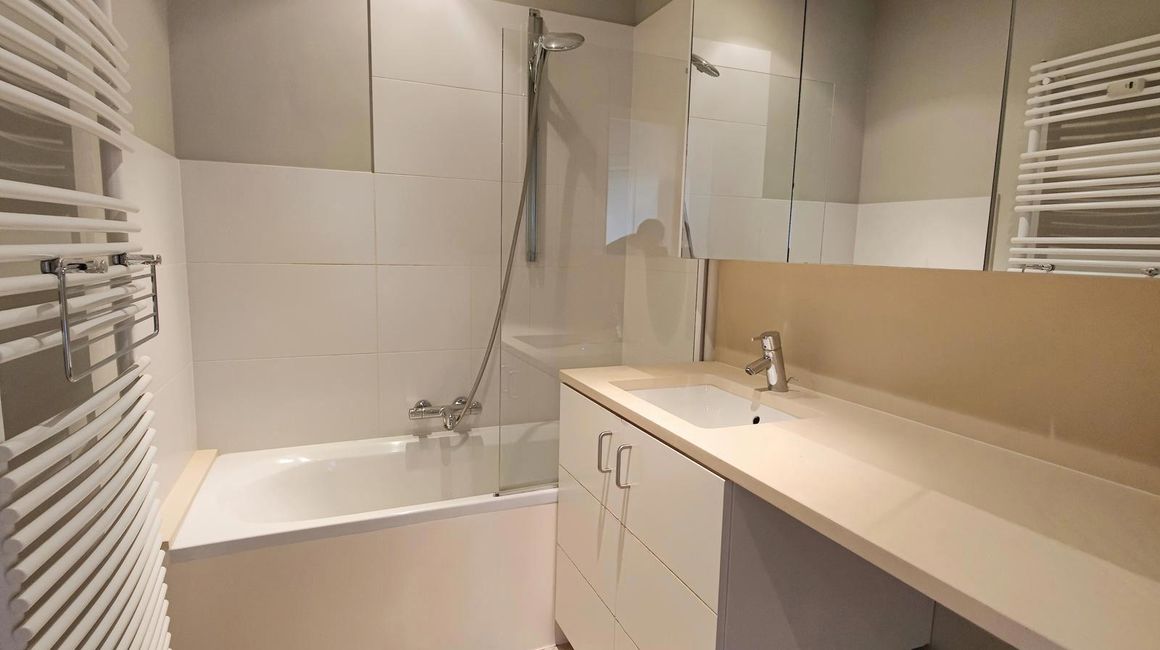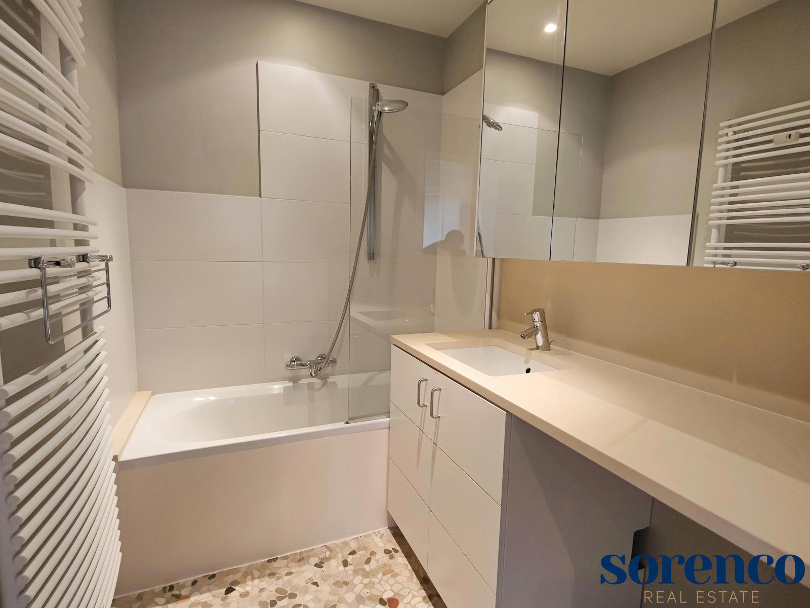 De nachthal geeft u toegang tot de 2 slaapkamers op parket: SLAAPKAMER 1 ca. 18,20m² met ingemaakte kast en SLAAPKAMER 2 ca. 10m². Ingerichte BADKAMER met dubbele lavabo in een meubel, handdoekdroger, ligbad met douchemogelijkheid