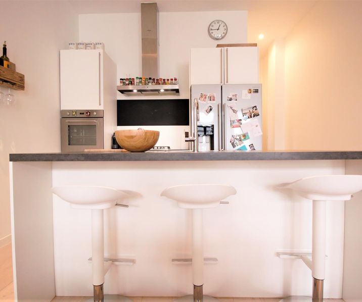 Verder bevindt zich de open ingerichte KEUKEN voorzien van een kookeiland, opbergkasten en alle toestellen; gasvuur, dampkap, ijskast, diepvriezer, oven, microgolfoven, afwasmachine ...