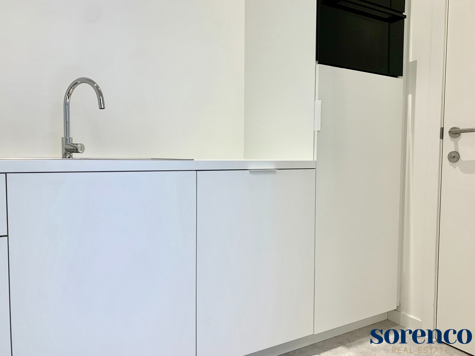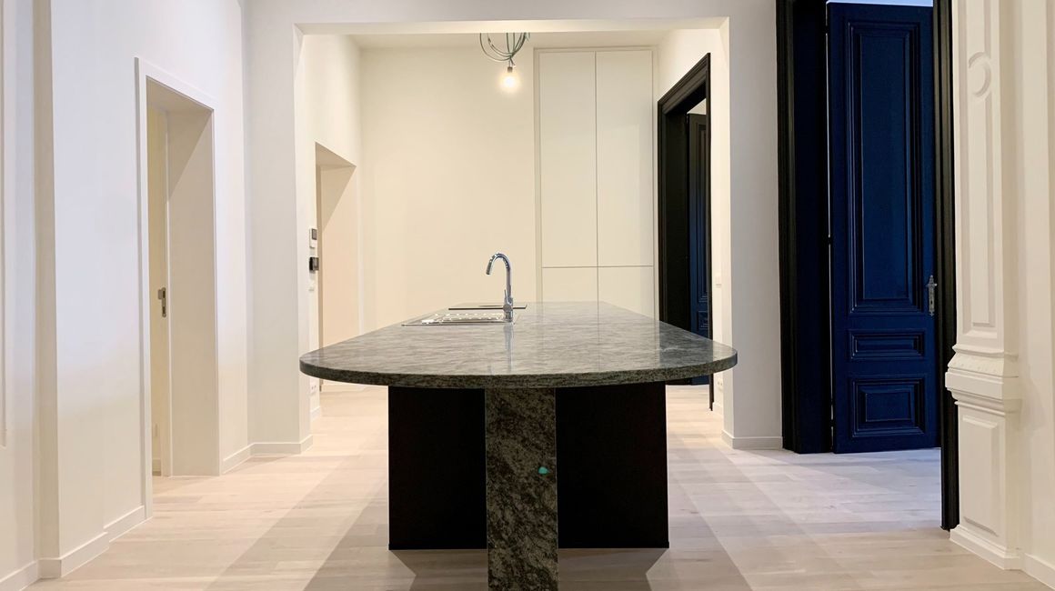 U komt binnen in de inkomhal met vestiaire en apart gastentoilet. De prachtige leefkeuken van ca.35m² is het centrale punt van het appartement, uitgerust met voldoende opbergkasten, ontbijthoek en moderne voorzieningen en aansluitend heeft u de karaktervolle leefruimte.