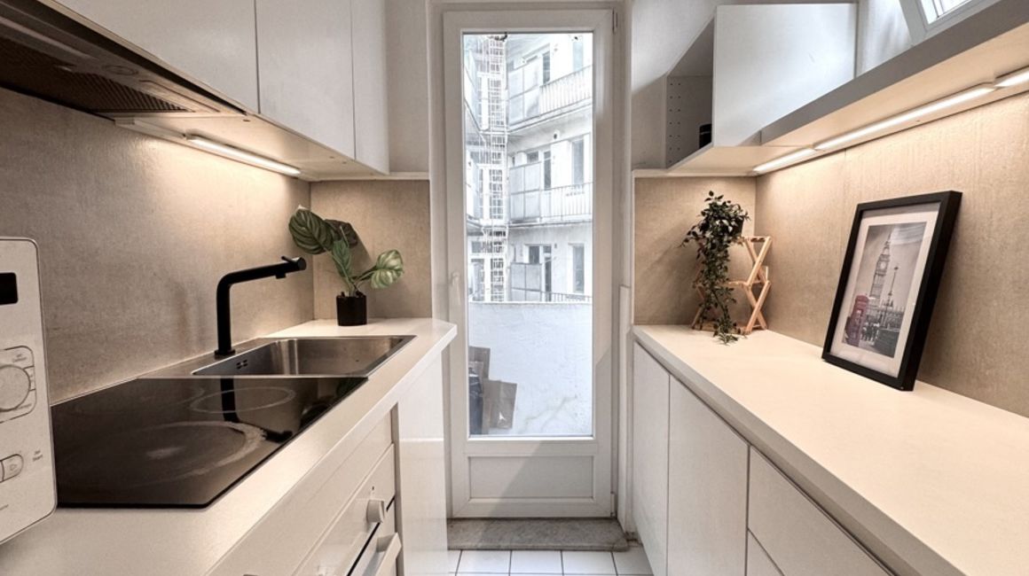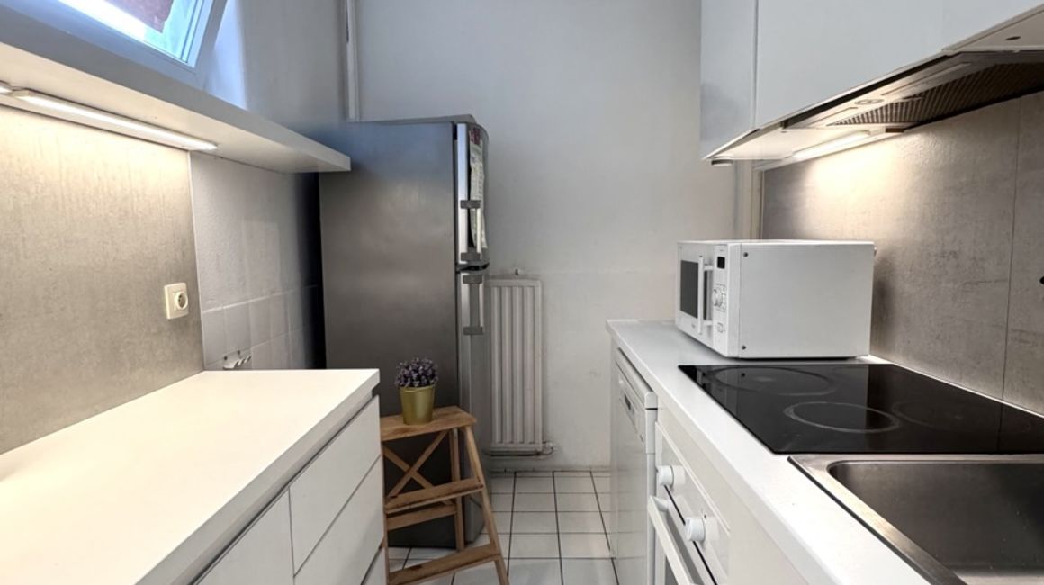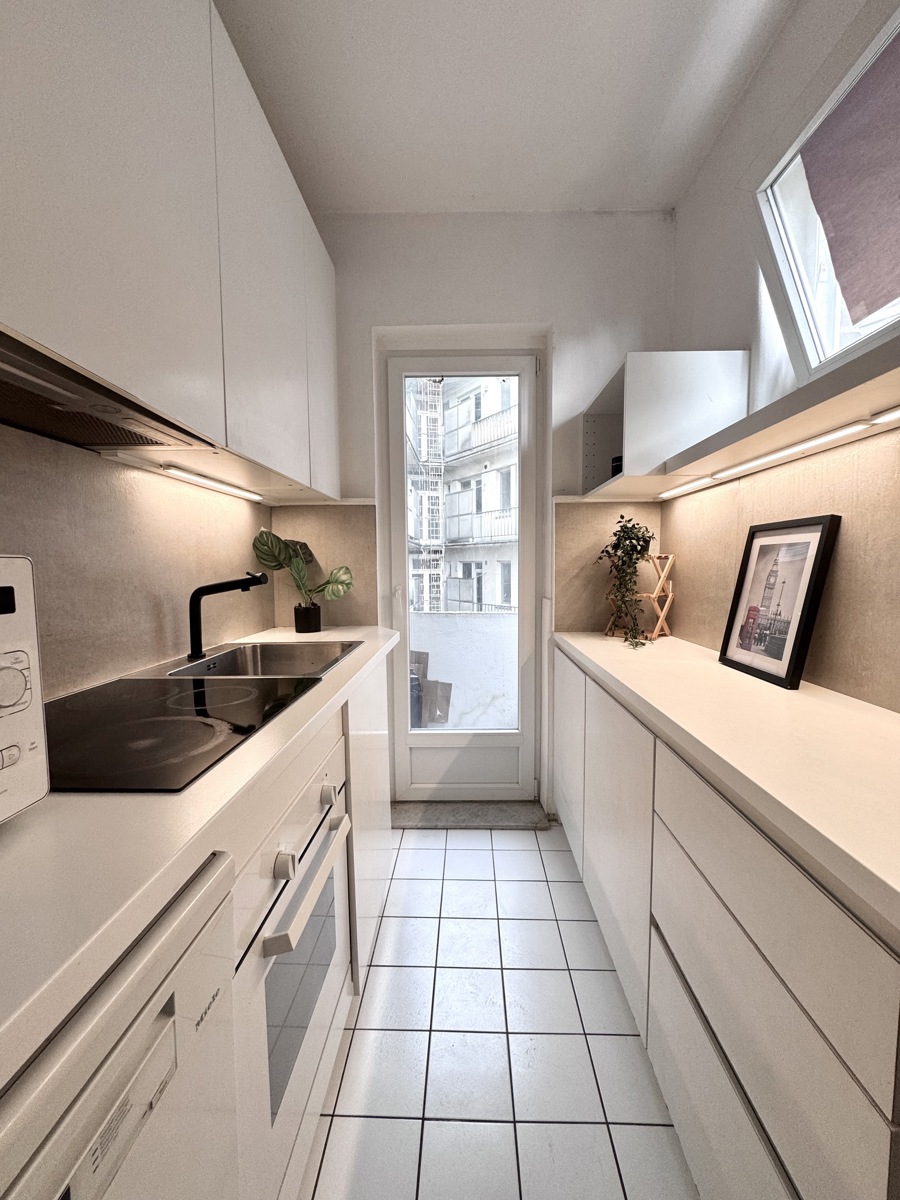 U komt het appartement binnen via de centraal gelegen INKOMHAL met vestiaire. Vooraan het appartement vinden we de lichte en gezellige LEEFRUIMTE (ca. 4,71m x ca. 6m). Volledig geïnstalleerde KEUKEN (ca. 3,5m x ca. 2m) voorzien van opbergkasten en alle toestellen: een keramisch 4-vuur, dampkap, een vaatwasser, een koelkast met drie vriesvakken, een combioven. De keuken geniet daarnaast nog van een balkon.