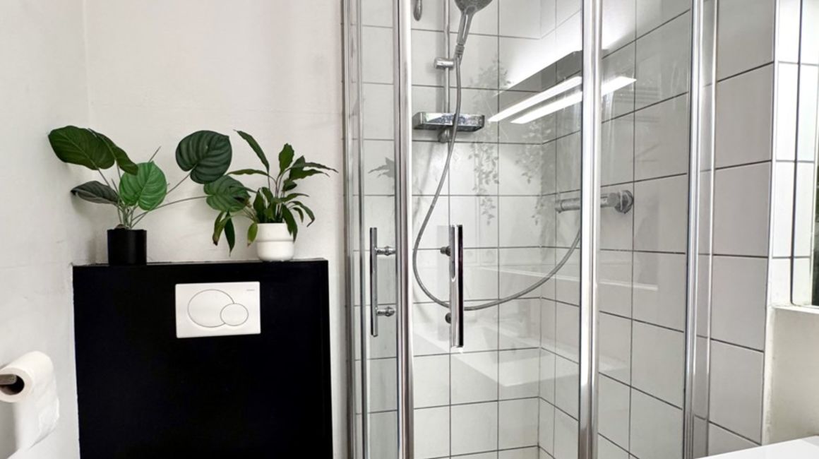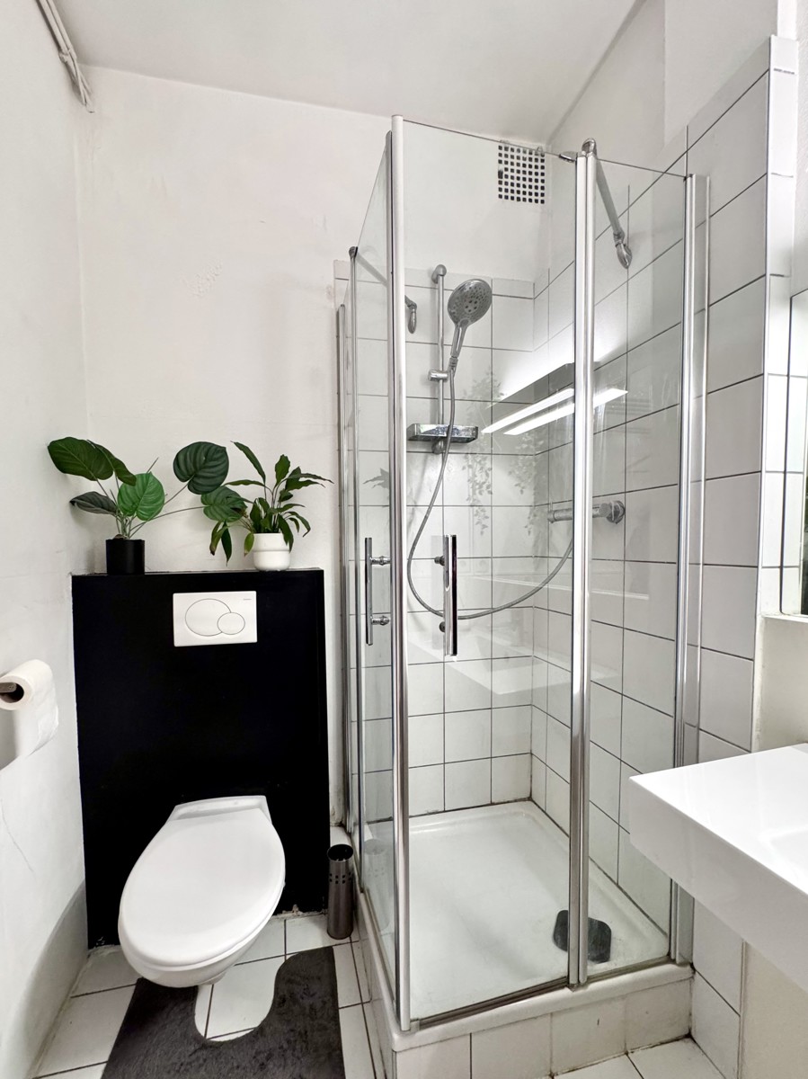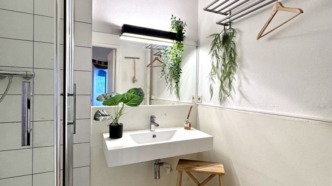 Tussen beide slaapkamer bevindt zich de BADKAMER (ca. 1,70m x 2,5m) die voorzien is van een douche, een wastafel, toilet en aansluitingen voor een wasmachine en een droogkast.