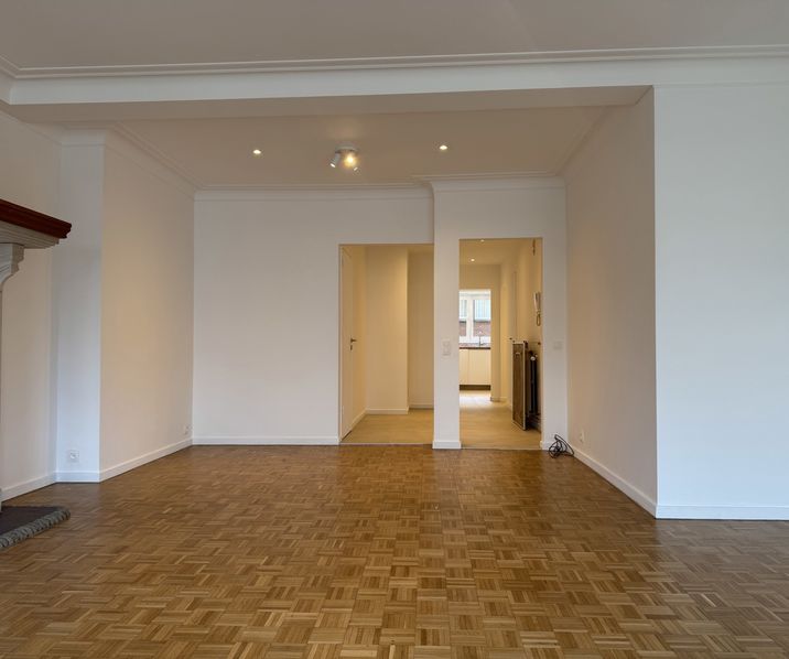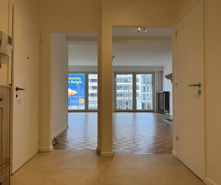 Via de inkomhal betreedt u het appartement. Verder komt u in de open en lichte LEEFRUIMTE ca. 39m². Volledig nieuw gerenoveerde KEUKEN ca. 7m² met volgende toestellen voorzien: kookplaat, dampkap, spoelbak, afwasmachine, koelkast en vriezer en oven.