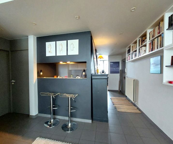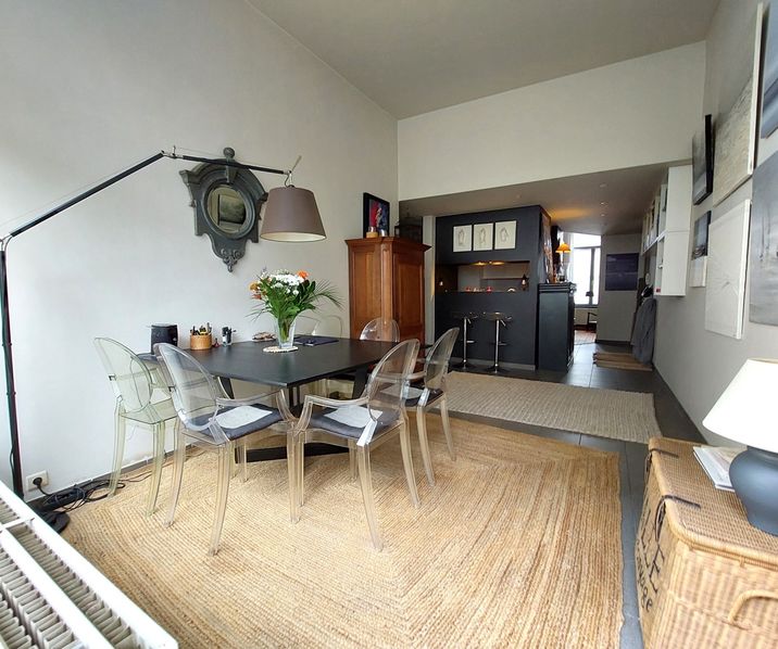 Via de inkomhal heeft men toegang tot de woonkamer die zich aan de voorkant bevindt en tot de halfopen keuken en de lichtrijke eetkamer die toegang geeft tot de smaakvol ingerichte stadstuin. De slaapkamer met haar douchekamer geeft ook op de tuin. Apart toilet en bijkeuken zijn ook aanwezig.