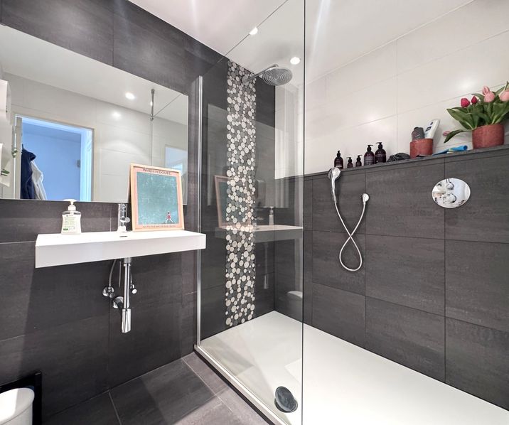Ingerichte BADKAMER voorzien van een lavabo en een inloop regendouche.