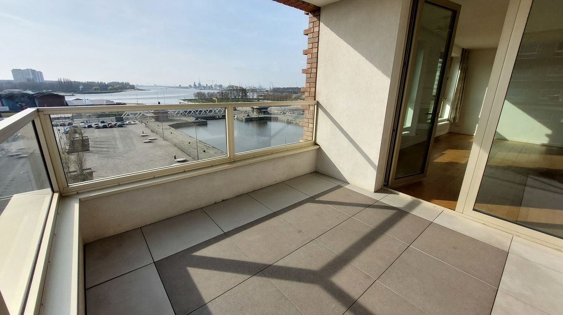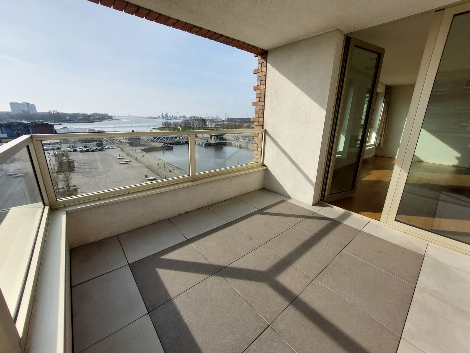 Uniek overdekt ZW-TERRAS van ca. 12,1m² te bereiken via de leefruimte welke een fantastisch uitzicht geeft over de dokken en het centrum van Antwerpen.