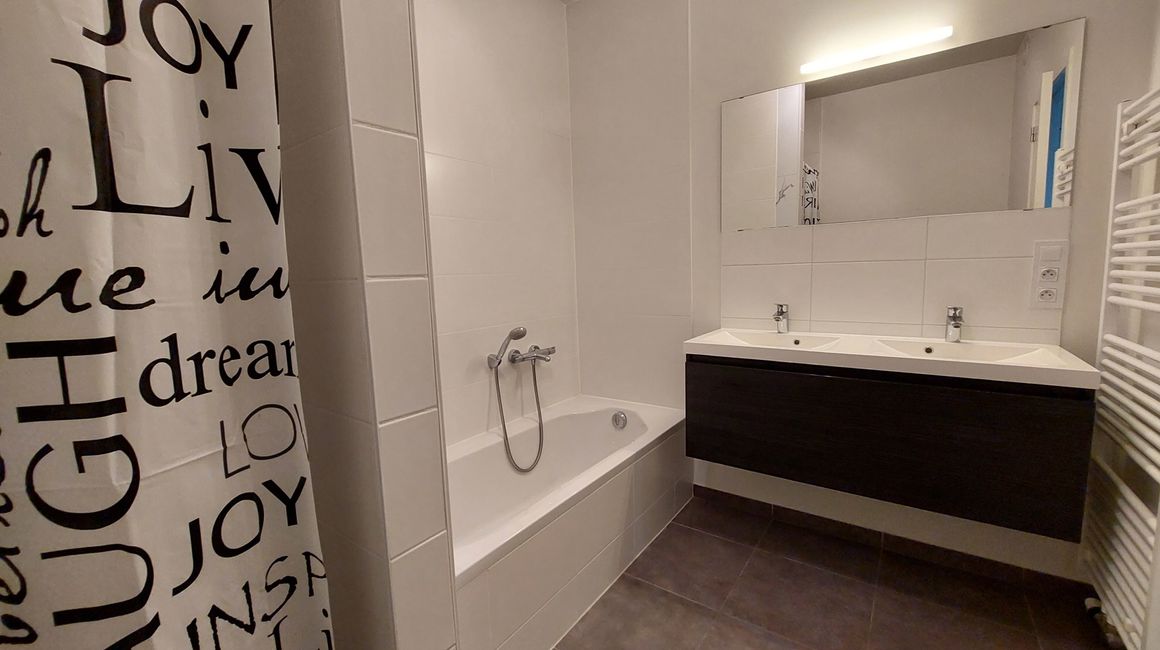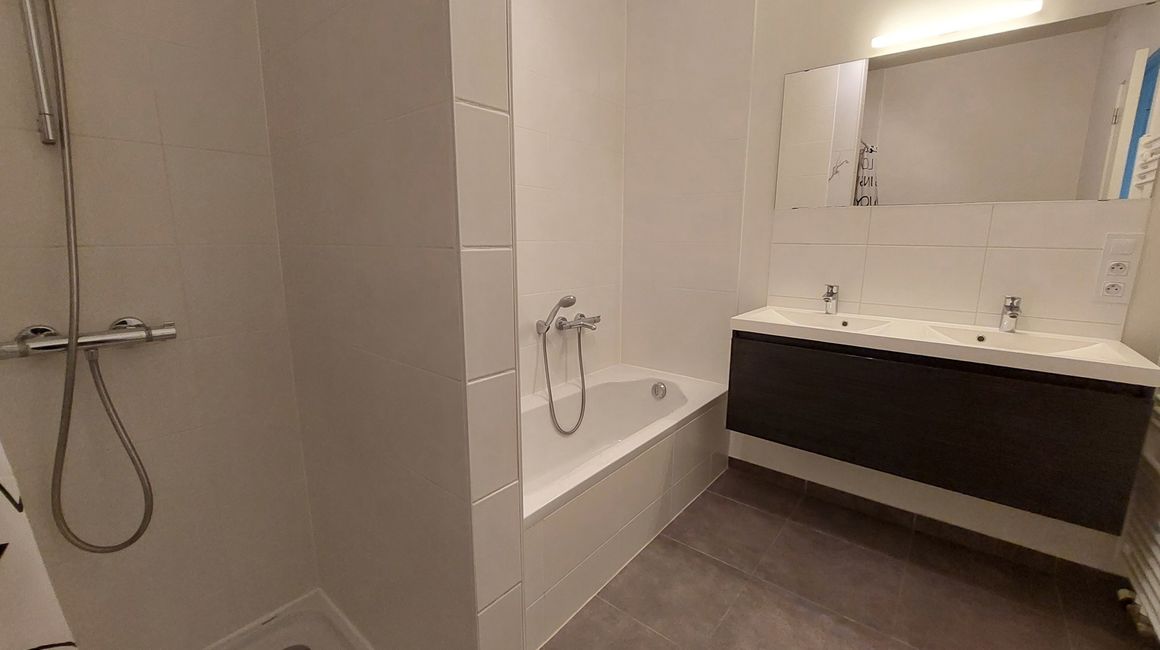 BADKAMER van ca. 6m² met ligbad, douche, handdoekdroger, dubbele lavabo in kastenmeubel en grote spiegel, bevloering op tegels.