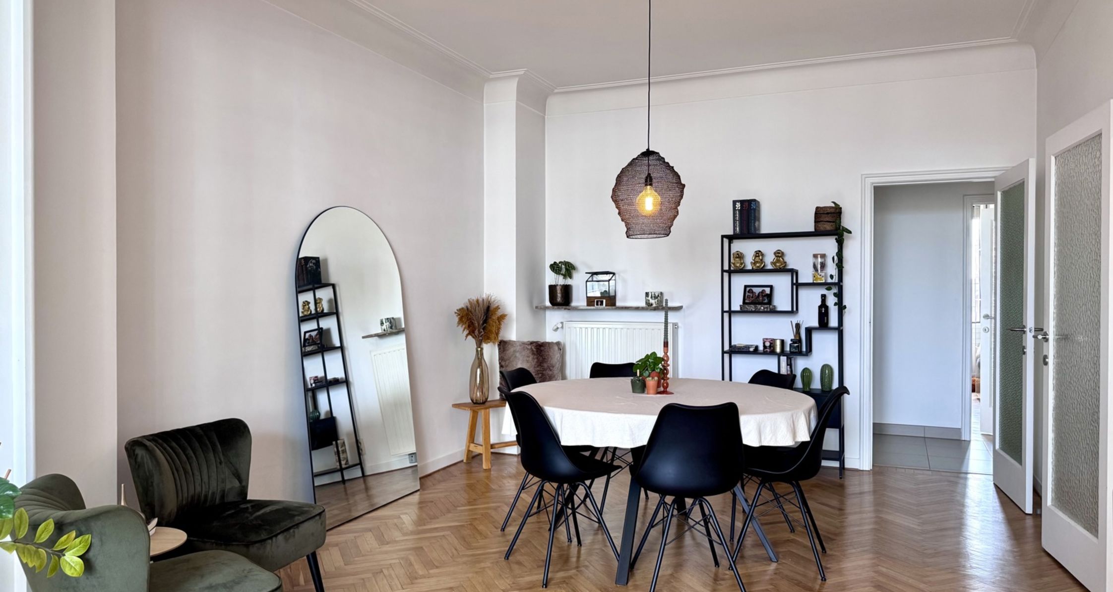 U betreedt het appartement via de INKOMHAL met apart gastentoilet. Van hieruit bereikt u de ruime LEEFRUIMTE op parket, ingedeeld in een gezellige WOONKAMER ca. 4,9 m x 3,8 m en een EETKAMER ca. 4,5 m x 3,8 m. In de woonkamer bevindt zich een ingebouwde kast die kan dienen als bergruimte. Daarnaast is er ook een ingebouwde glazenkast aanwezig.
