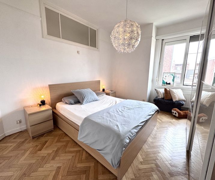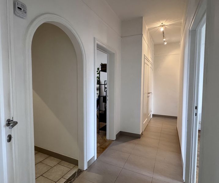 De gang geeft u toegang tot de 2 SLAAPKAMERS op parket en de ingerichte BADKAMER ca. 1,7 m x 3,3 m, voorzien van een douche en een wastafel met spiegel. Ook de aansluiting voor de wasmachine is hier aanwezig.