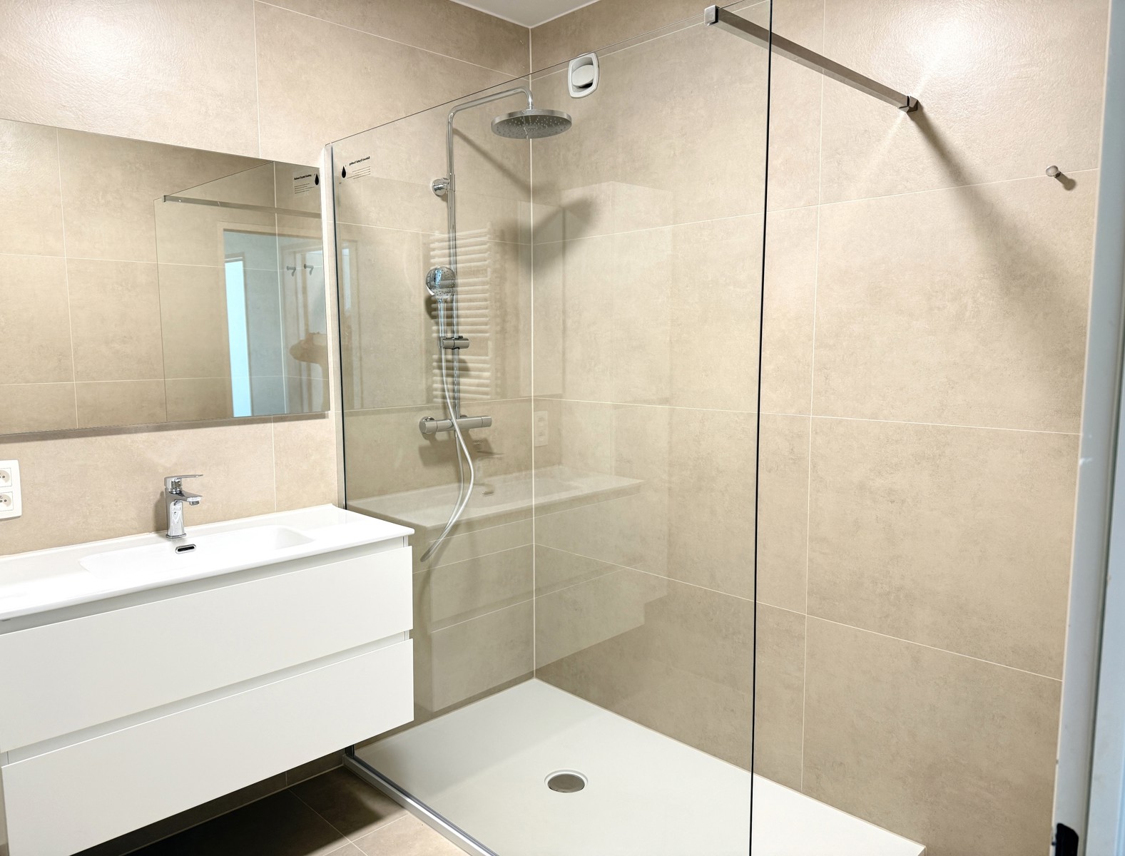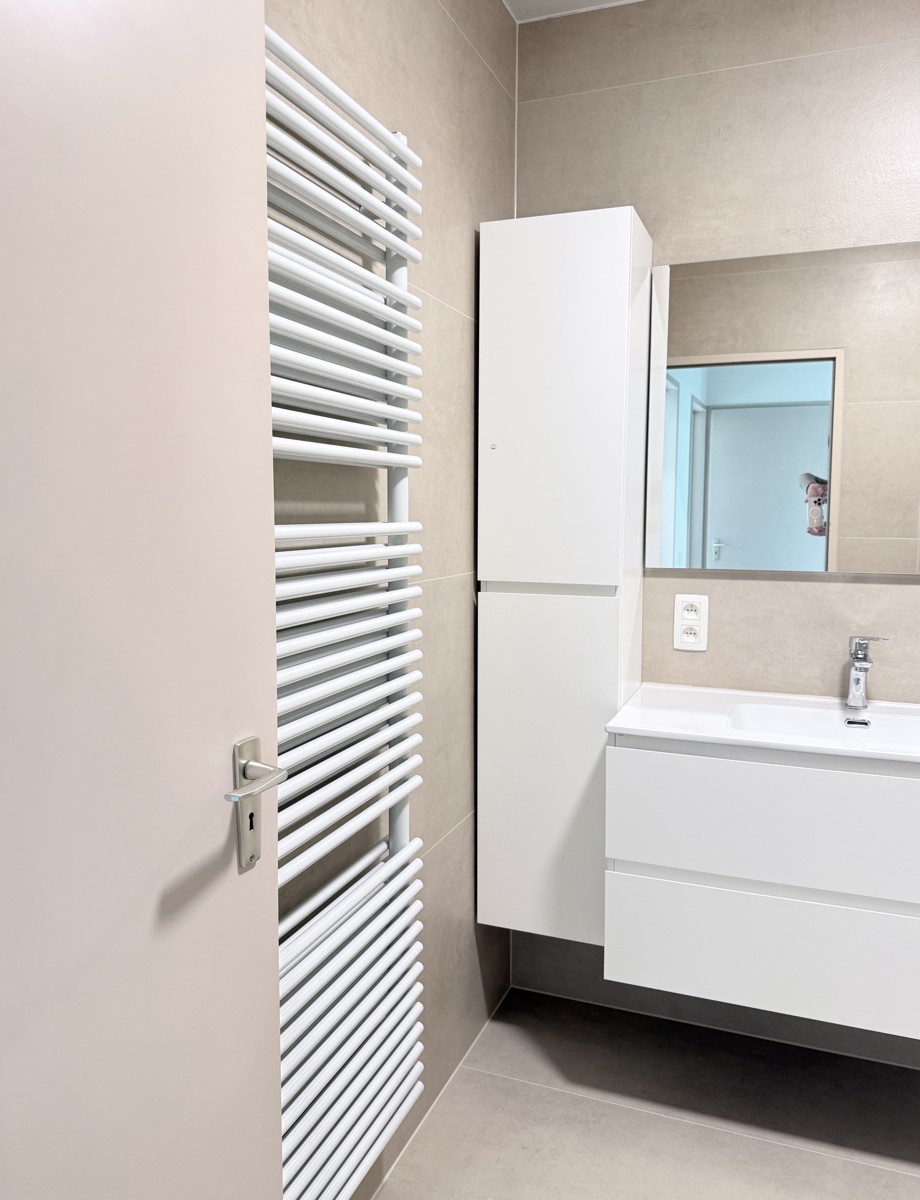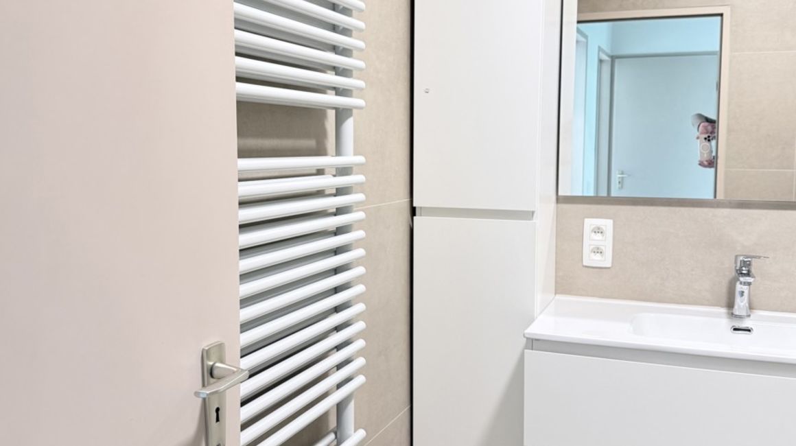 Aan de achterzijde van het gebouw bevinden zich de twee volwaardige slaapkamers van respectievelijk ca. 2,37m x 4,38m en ca. 4,38m x 3,47m. Beide kamers beschikken over een praktische kastenwand en bieden toegang tot het tweede terras van ca. 4,20m x 1,77m, dat zuidwestelijk georiënteerd is. De stijlvolle badkamer ca. 2,27m x 2,19 m is afgewerkt met beige tegels en beschikt over een wastafel in een kastmeubel, een inloopdouche en een handdoekdroger. Verder is er een extra berging voor de wasmachine en droogkast, een diepe ingemaakte kast.
