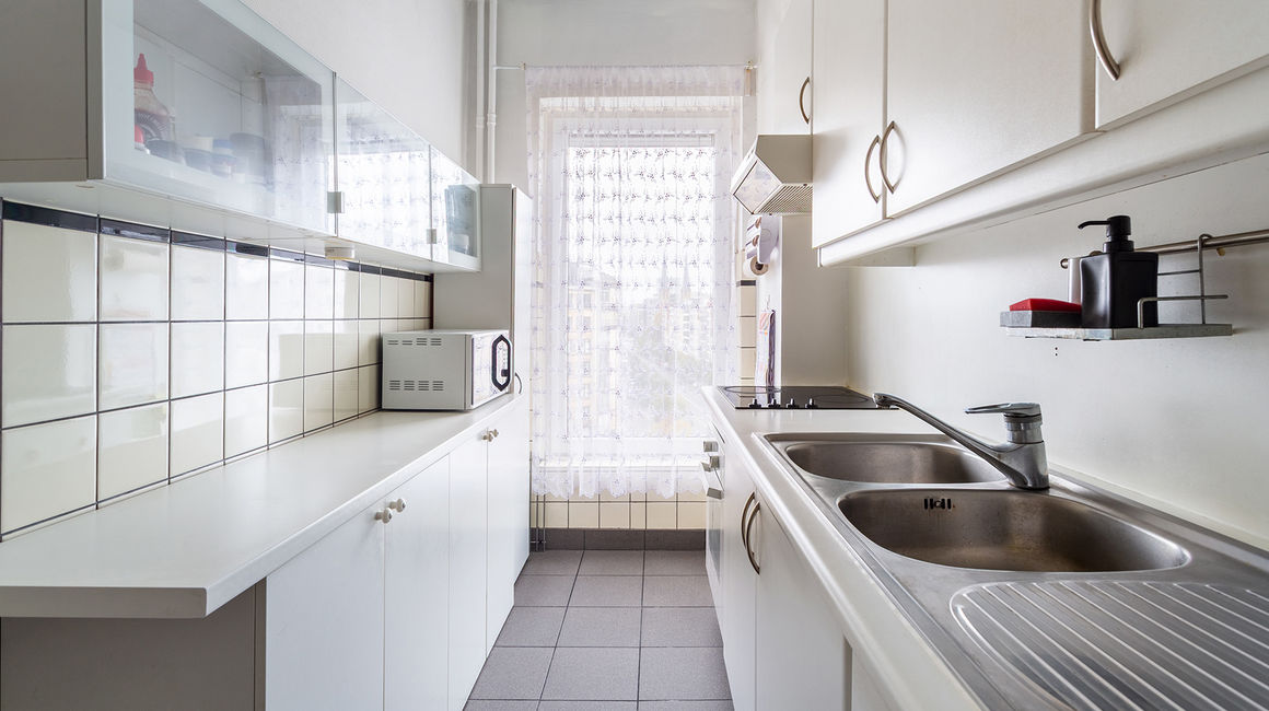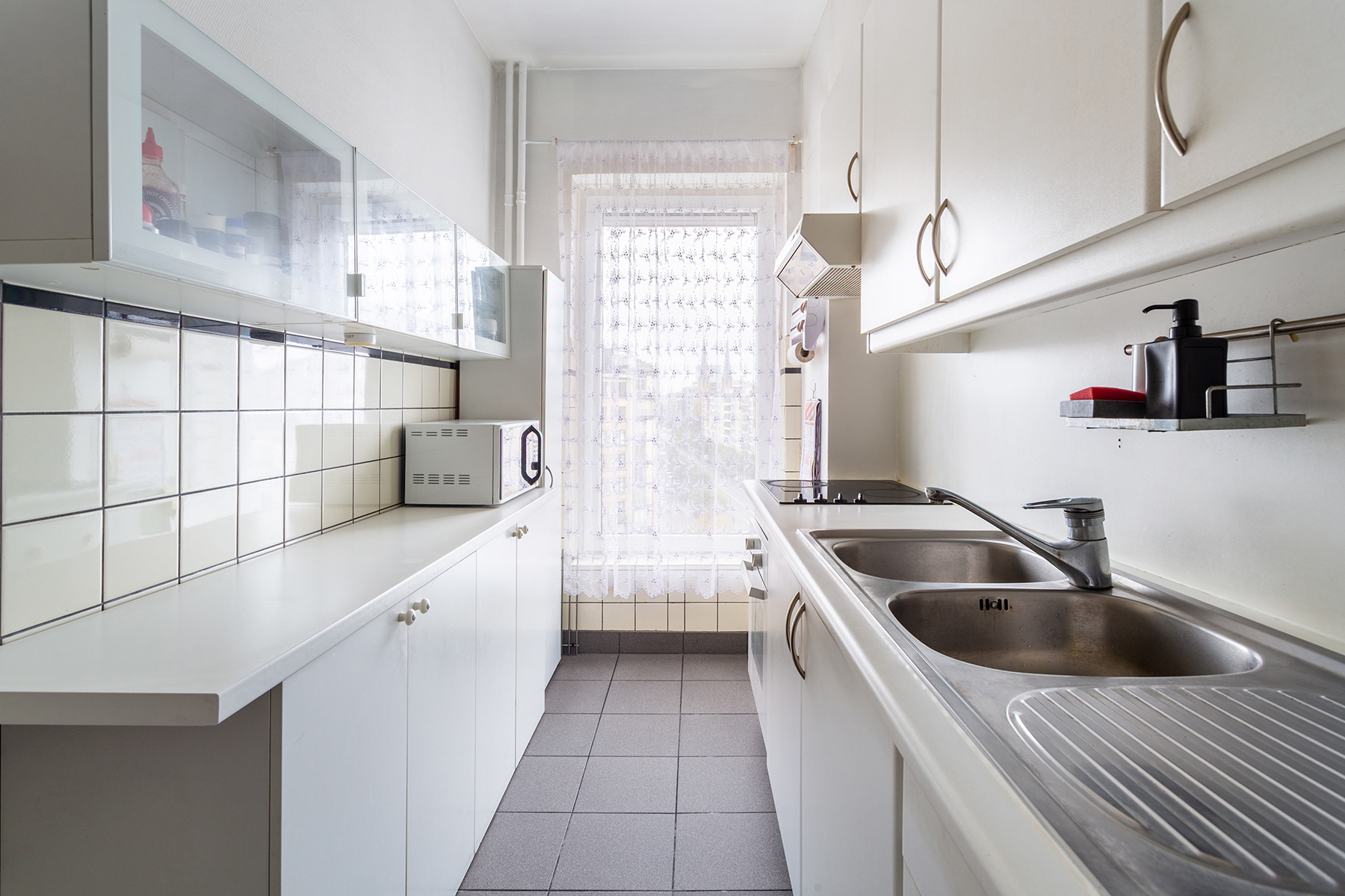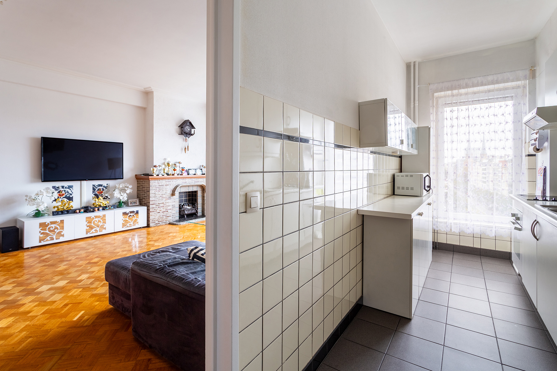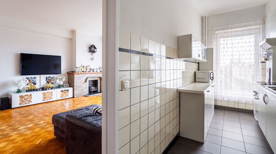 De lichte leefruimte (ca. 4,83m x 6,48m) op parketvloer geniet van veel natuurlijk licht dankzij de grote raampartijen en is voorzien van een sierhaard. Aansluitend bevindt zich de moderne, ingerichte keuken (ca. 5,60m x 1,74m) met toestellen en opbergkasten.
