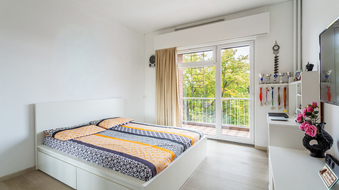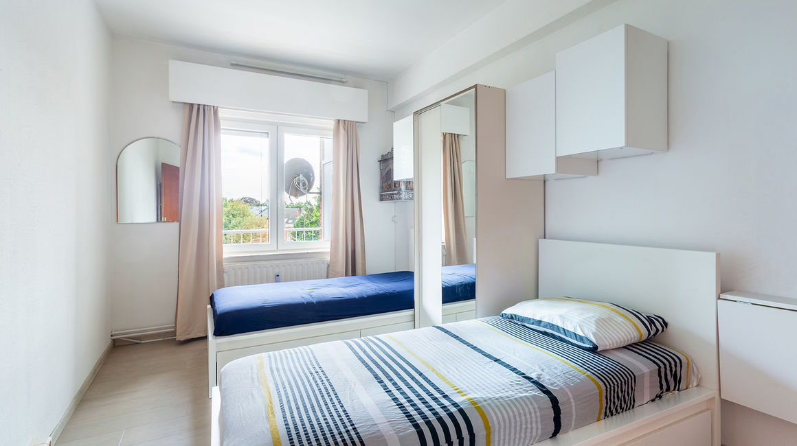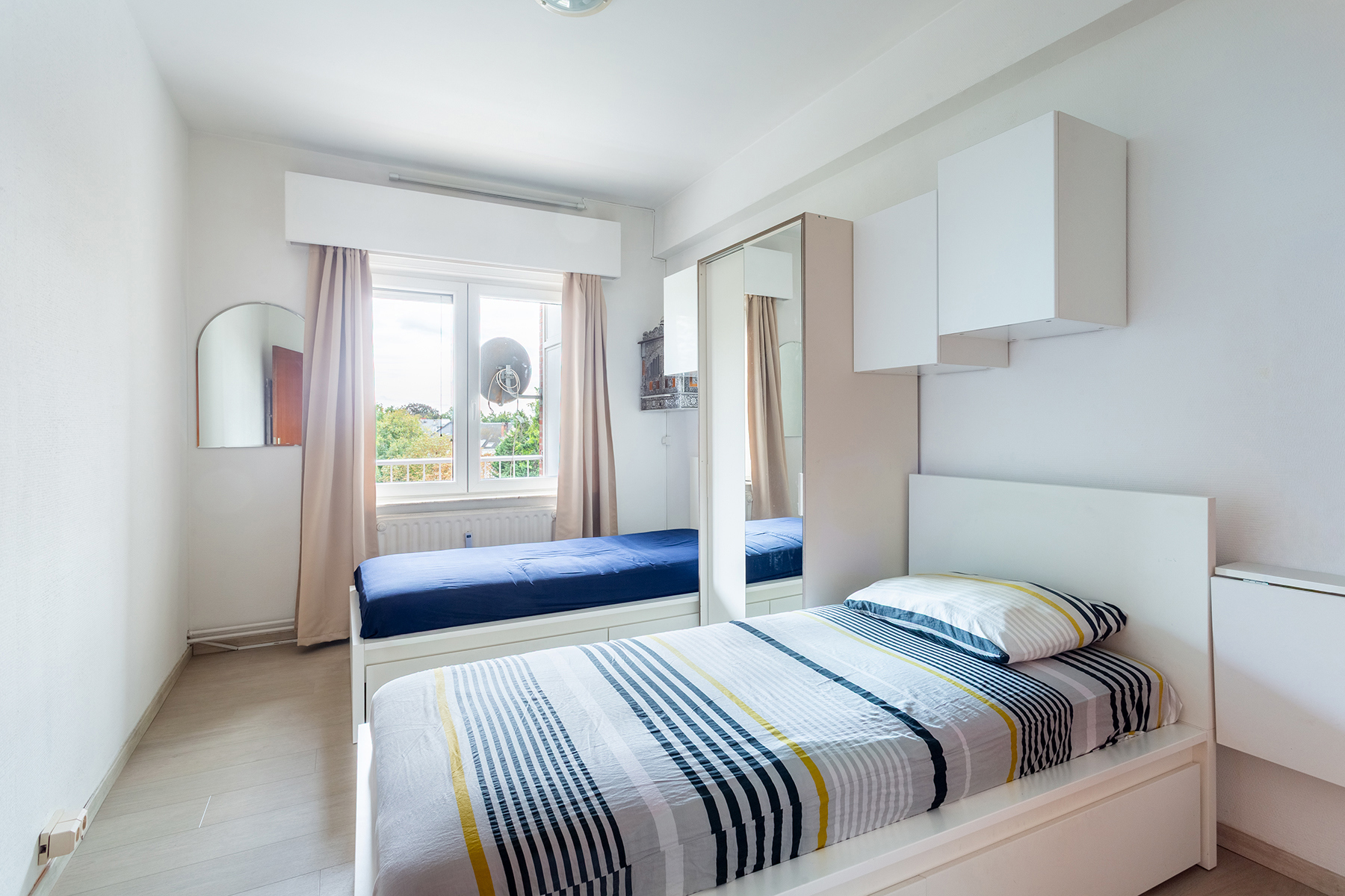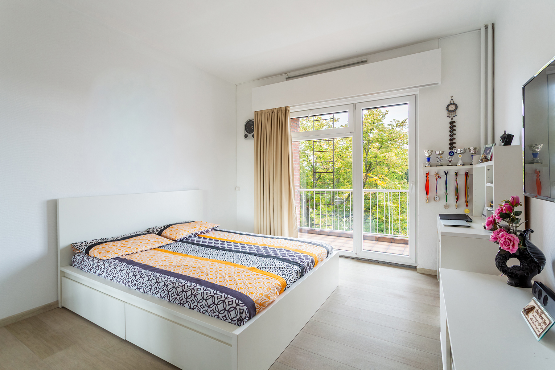 Achteraan het gebouw liggen de twee slaapkamers: de hoofdslaapkamer (ca. 3,58m x 4,31m) en de tweede slaapkamer (2,87m x 4,15m). Beide kamers bieden toegang tot het zuid-oost georiënteerde terras (ca. 8 m²), waar het aangenaam vertoeven is.