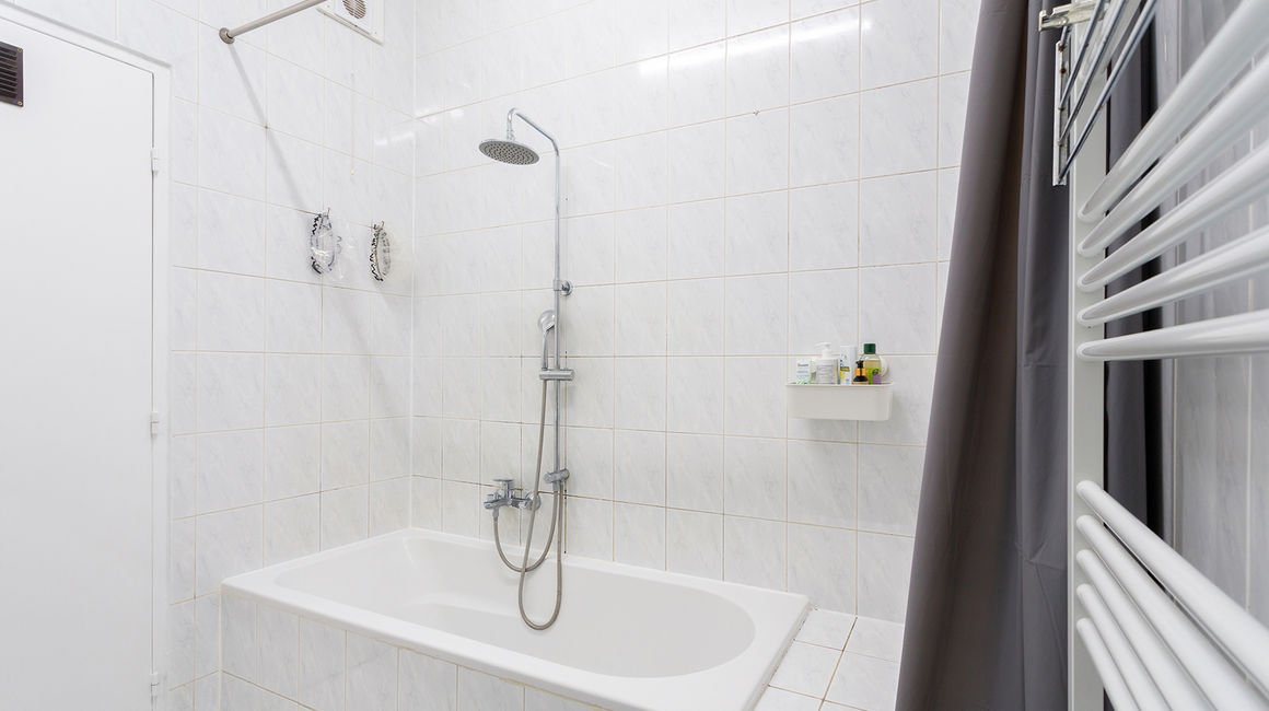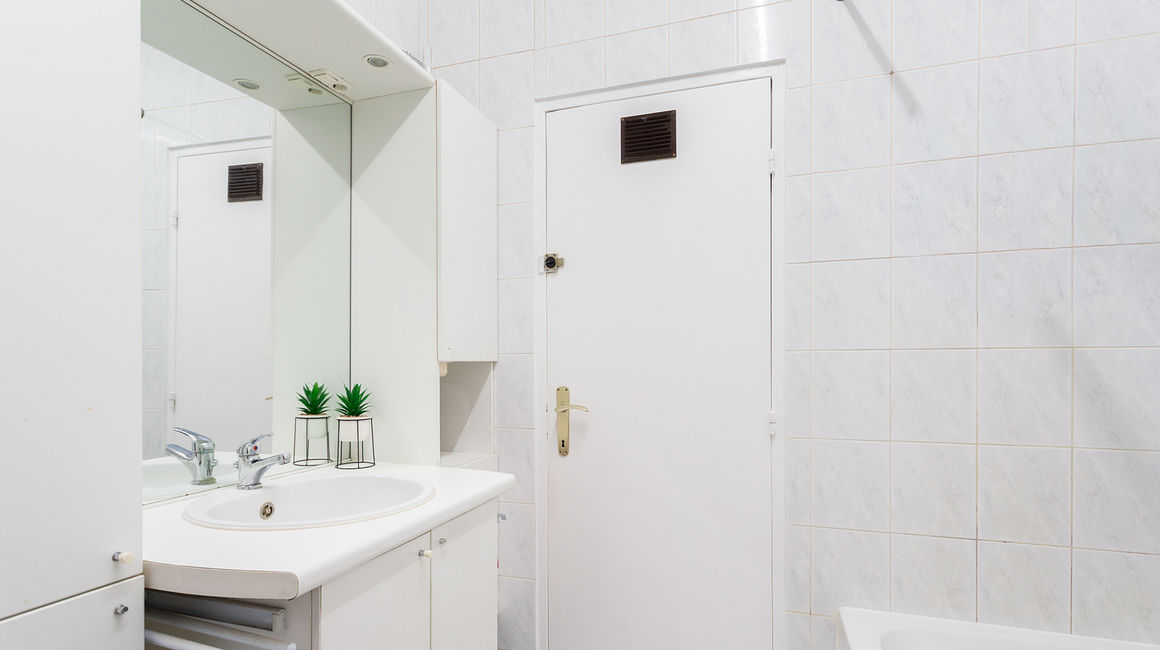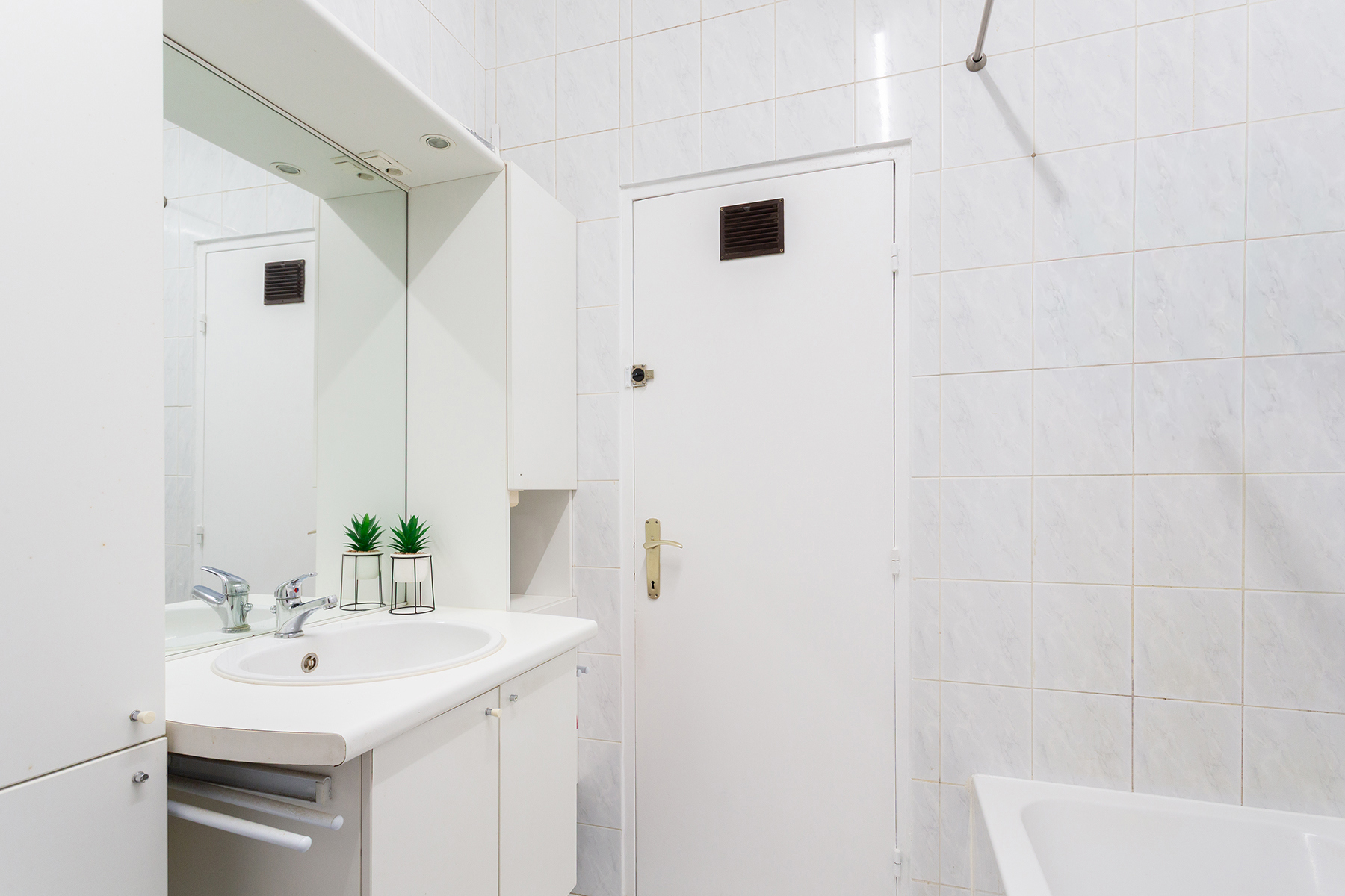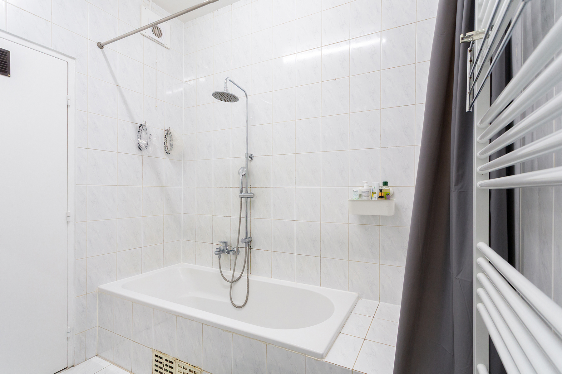 De badkamer (ca. 2,30m x 2,10m) is uitgerust met een douche in ligbad, een dubbele wastafel en aansluitingen voor wasmachine en droogkast.