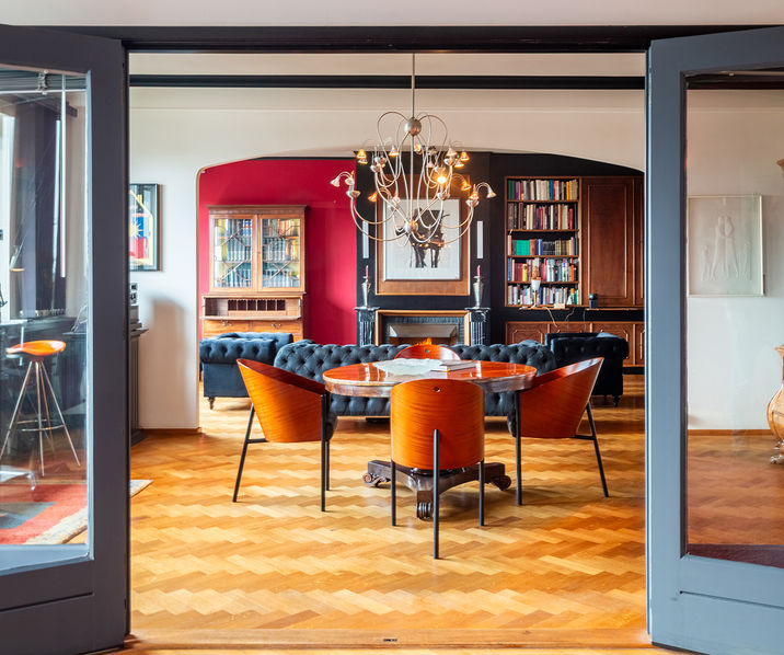 The place to be! Via de Art-Deco hal met 2 liften betreedt u het penthouse appartement van ca 265 mē op de 8e verdieping met een vrij uitzicht over het Koning Albertpark, de omliggende tuinen van het Provinciehuis en notarishuis als naaste buren. Inkomhal met ruime vestiaire en gastentoilet. De sfeervolle leefruimte biedt u de nodige rust en comfort, genieten van de schitterende bibliotheek met lambrisering en een gas openhaard. De riante living op originele visgraadparket herbergt het salon, zitkamer, eetkamer.