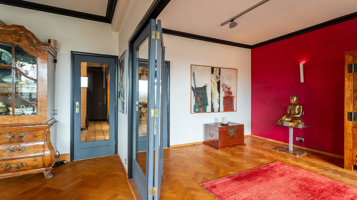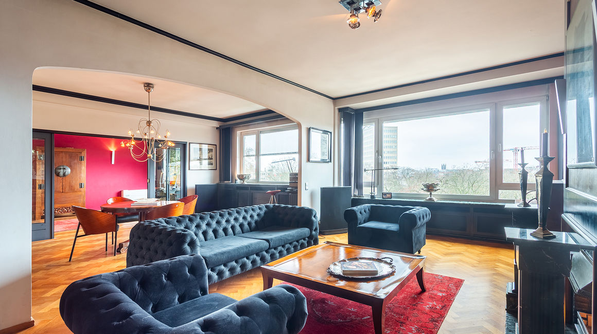 The place to be - a penthouse with a vieuw! Via de Art-Deco hal met 2 liften betreedt u het penthouse appartement van ca 265 m² op de 8e verdieping met een vrij uitzicht over het Koning Albertpark, de omliggende tuinen van het Provinciehuis en notarishuis als naaste buren. Inkomhal met ruime vestiaire en gastentoilet. De sfeervolle leefruimte biedt u de nodige rust en comfort, genieten van de schitterende bibliotheek met lambrisering en een gas open haard. De riante living op originele visgraatparket herbergt het salon, zitkamer, eetkamer.