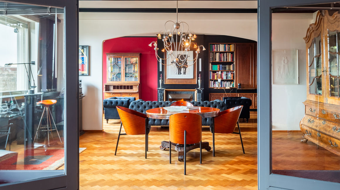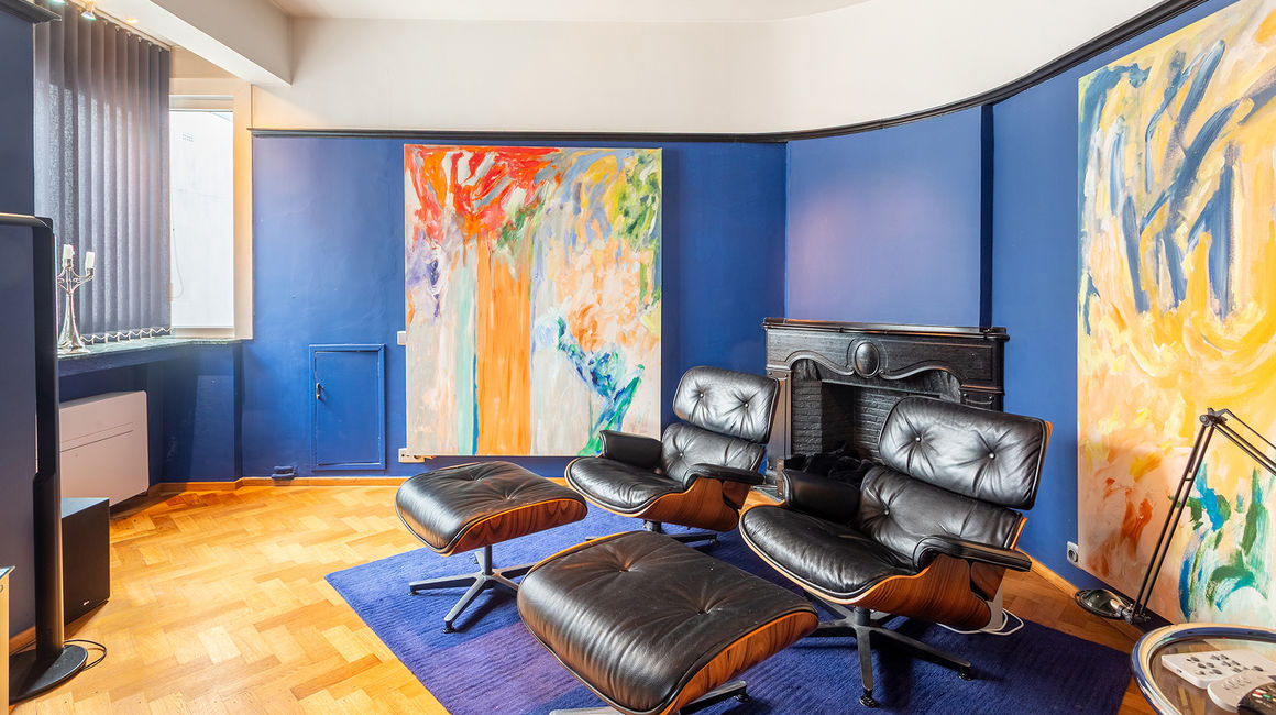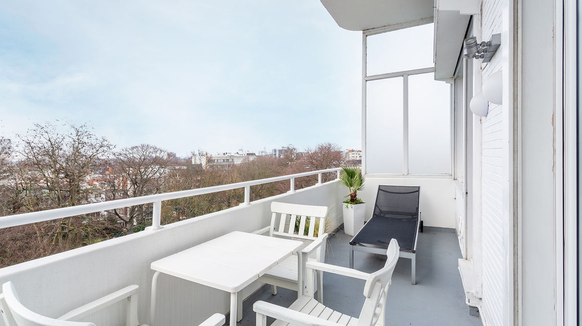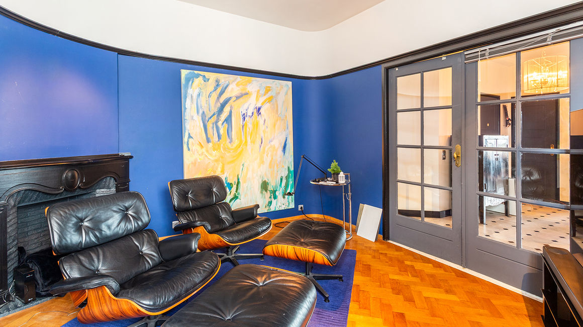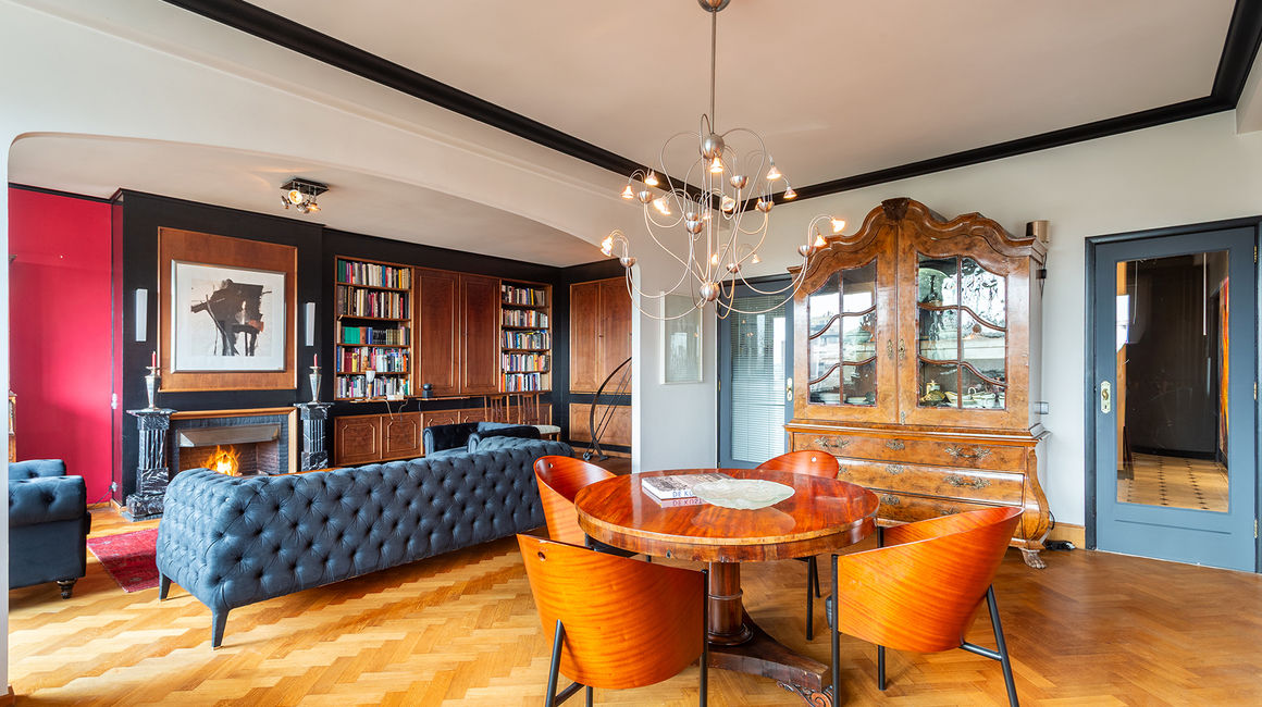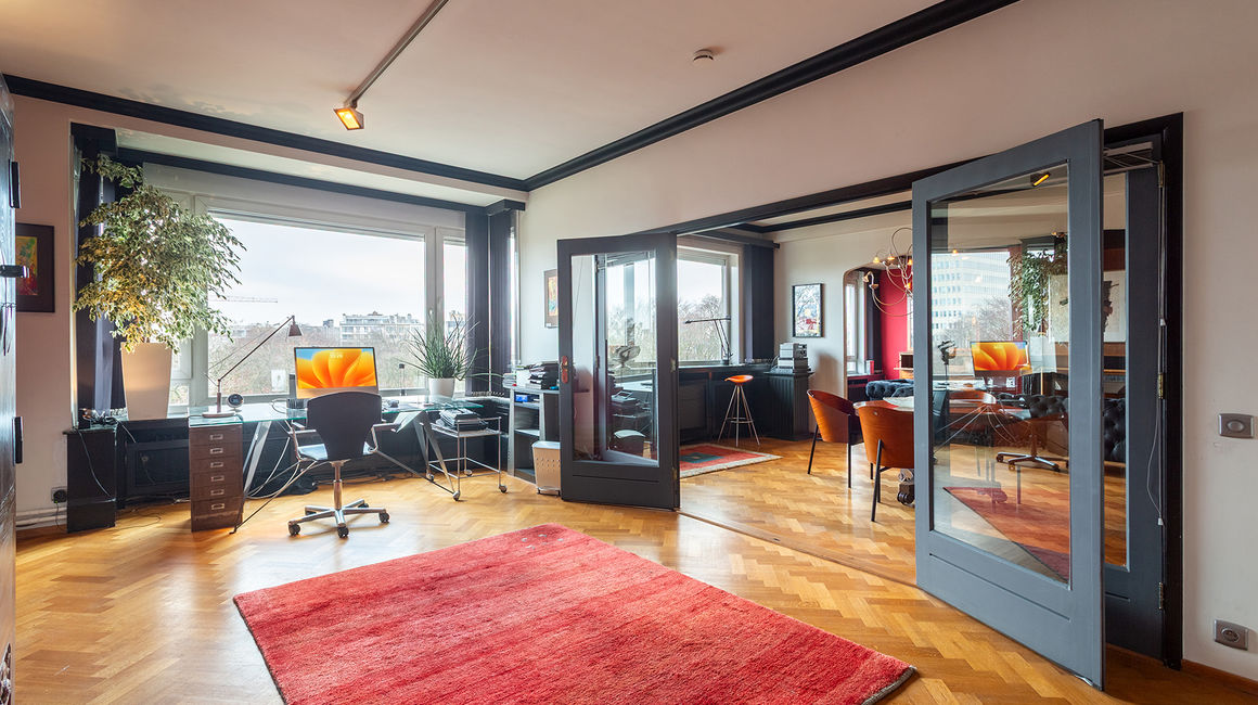 The place to be - a penthouse with a vieuw! Via de Art-Deco hal met 2 liften betreedt u het penthouse appartement van ca 265 m² op de 8e verdieping met een vrij uitzicht over het Koning Albertpark, de omliggende tuinen van het Provinciehuis en notarishuis als naaste buren. Inkomhal met ruime vestiaire en gastentoilet. De sfeervolle leefruimte biedt u de nodige rust en comfort, genieten van de schitterende bibliotheek met lambrisering en een gas open haard. De riante living op originele visgraatparket herbergt het salon, zitkamer, eetkamer.
