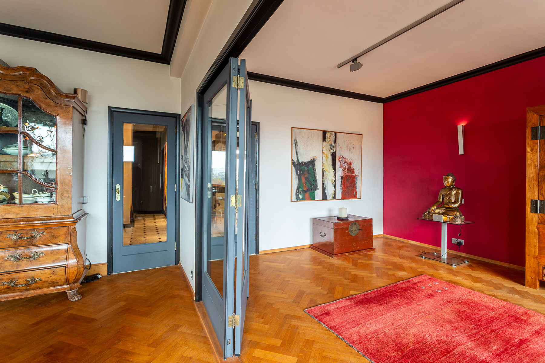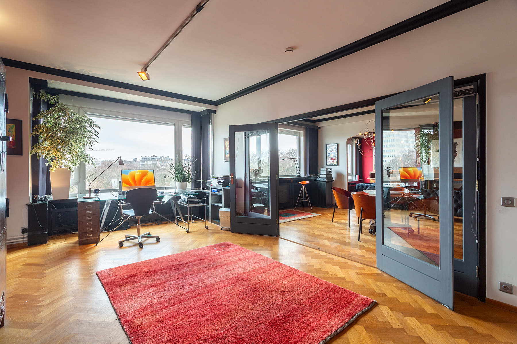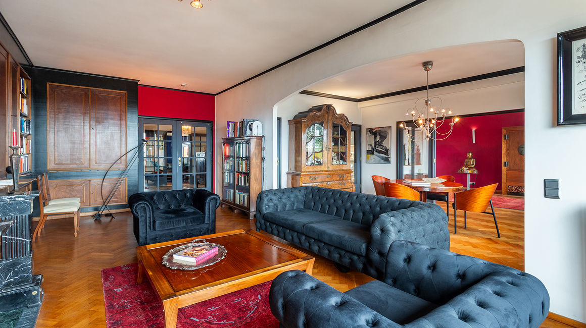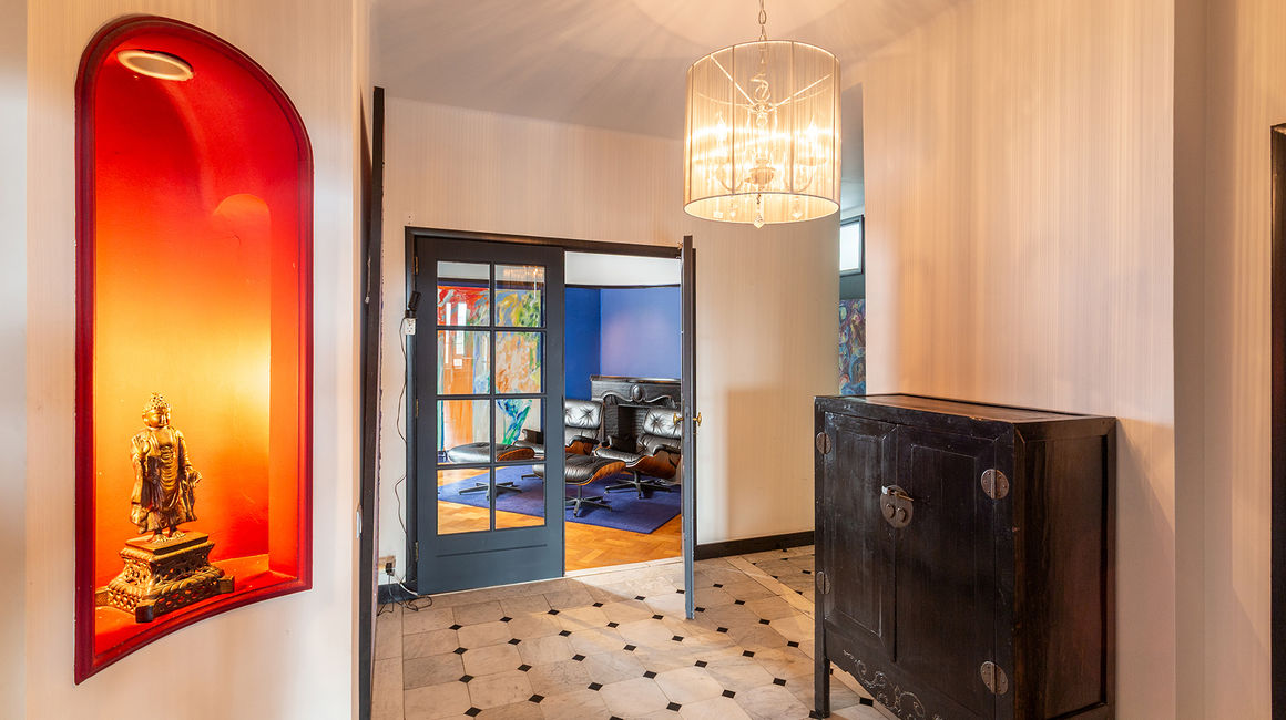 The place to be - a penthouse with a vieuw! Via de Art-Deco hal met 2 liften betreedt u het penthouse appartement van ca 265 m² op de 8e verdieping met een vrij uitzicht over het Koning Albertpark, de omliggende tuinen van het Provinciehuis en notarishuis als naaste buren. Inkomhal met ruime vestiaire en gastentoilet. De sfeervolle leefruimte biedt u de nodige rust en comfort, genieten van de schitterende bibliotheek met lambrisering en een gas open haard. De riante living op originele visgraatparket herbergt het salon, zitkamer, eetkamer.