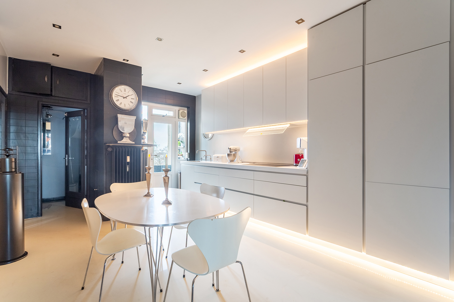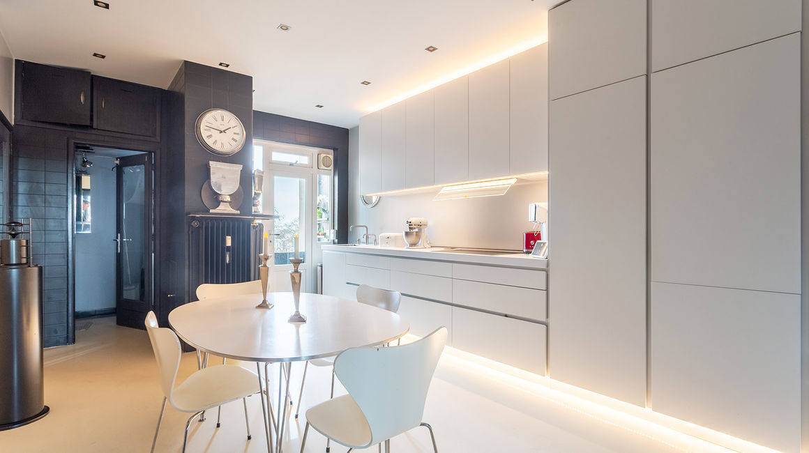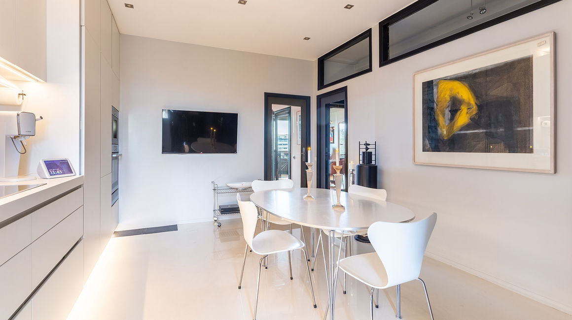 Een moderne Bulthaup leefkeuken contrasteert met een witte epoxyvloer en beschikt over ruim voldoende kastruimte, toestellen van Bosch & Siemens. Ze is voorzien van ledverlichting, TV, muziekinstallatie en een klein terrasje. Bergruimte met aansluiting voor wasmachine en droogkast.