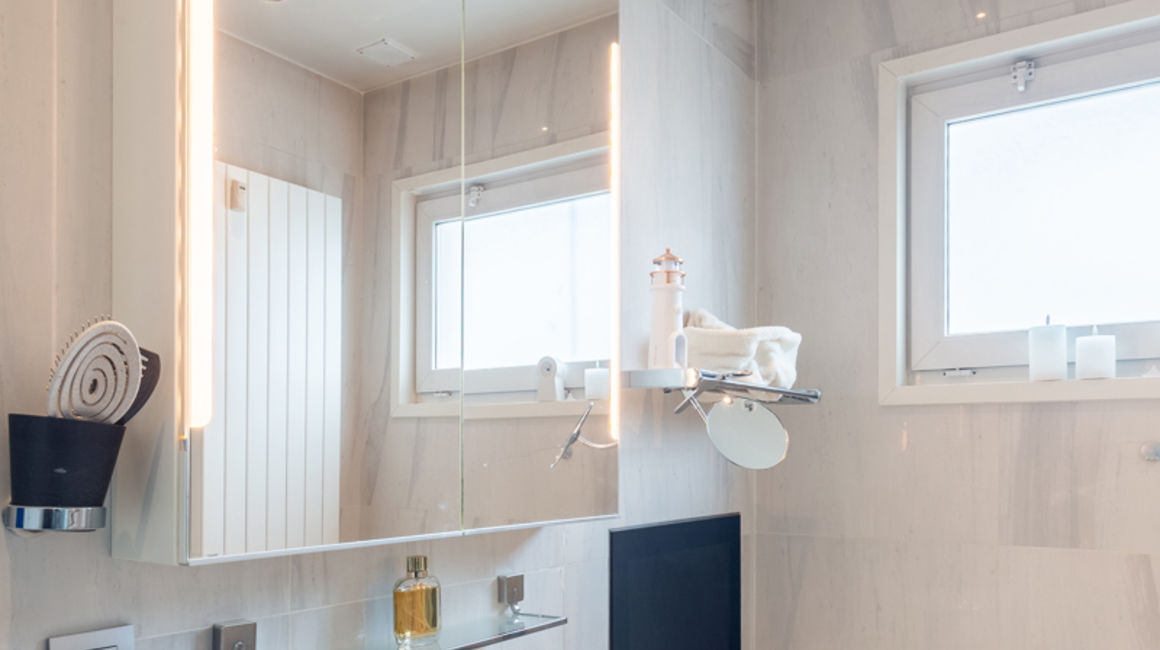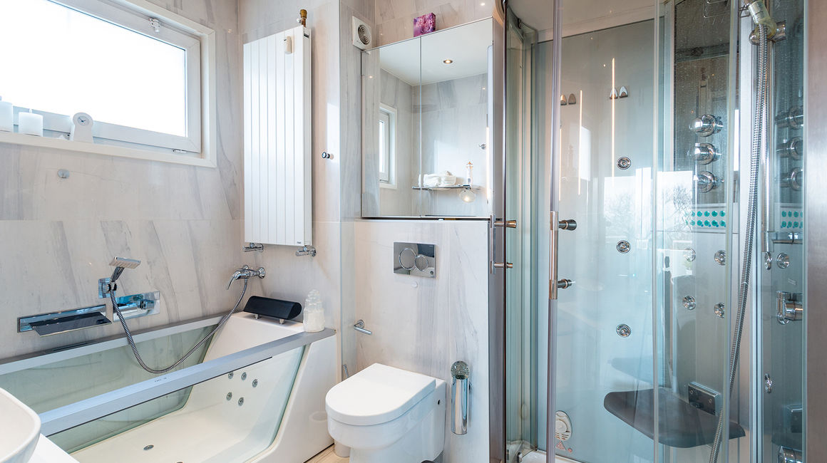 Via de nachtgang bereikt u de twee ruime slaapkamers en de gastenkamer. Twee luxe en suite wellness badkamers met inloop stoomdouches, een Whirlpool badkuip/jacuzzi, ingebouwde muziekinstallatie en waterproof inbouw tv. Achteraan het appartement is een zonneterras van ca 12 m² met uitzicht op groen.