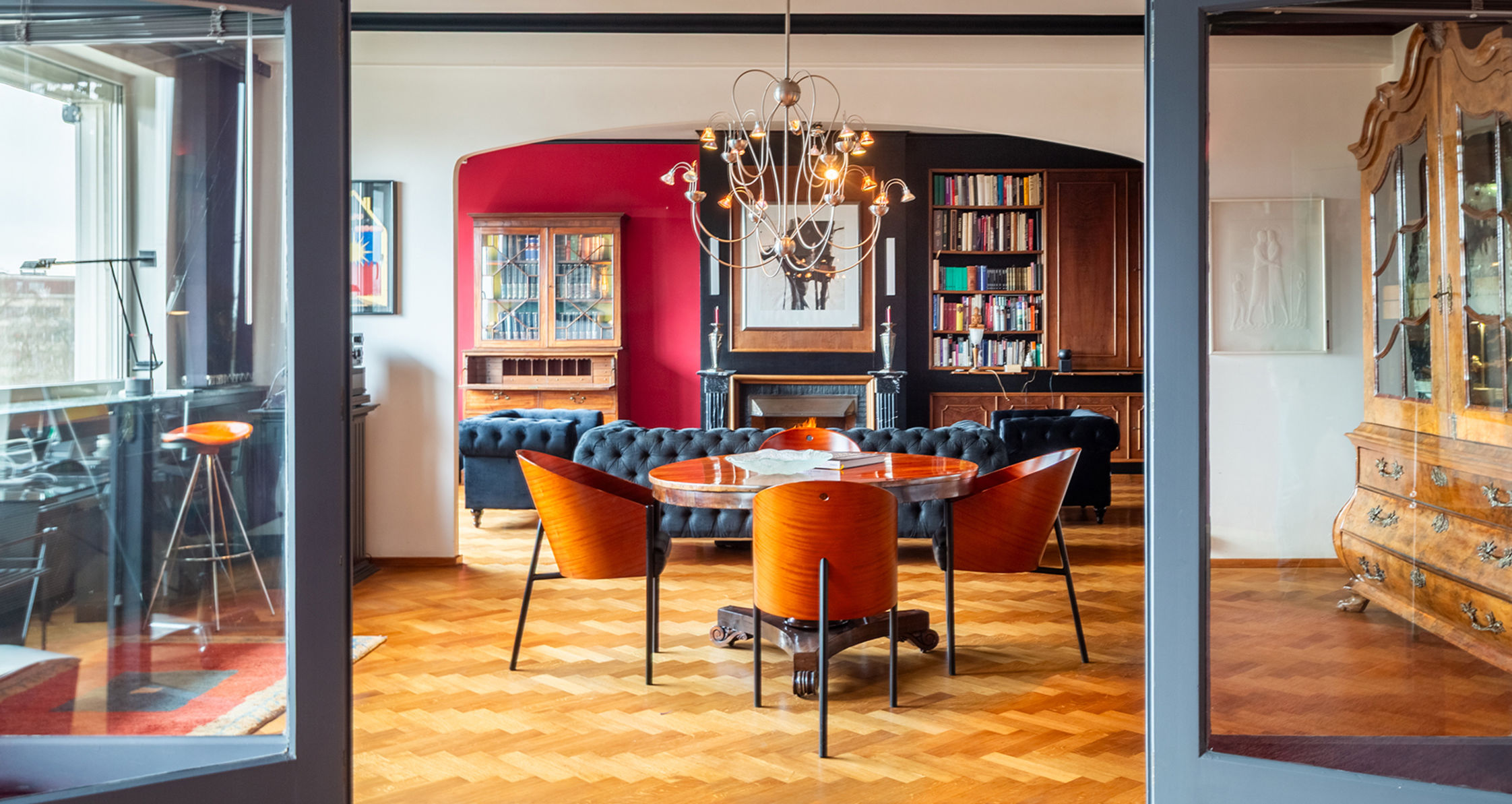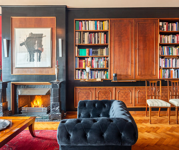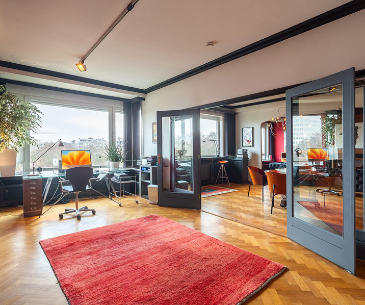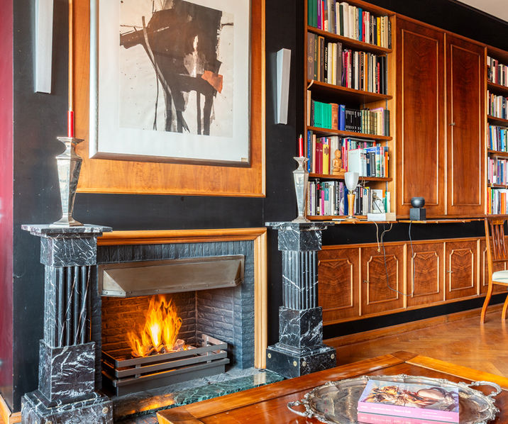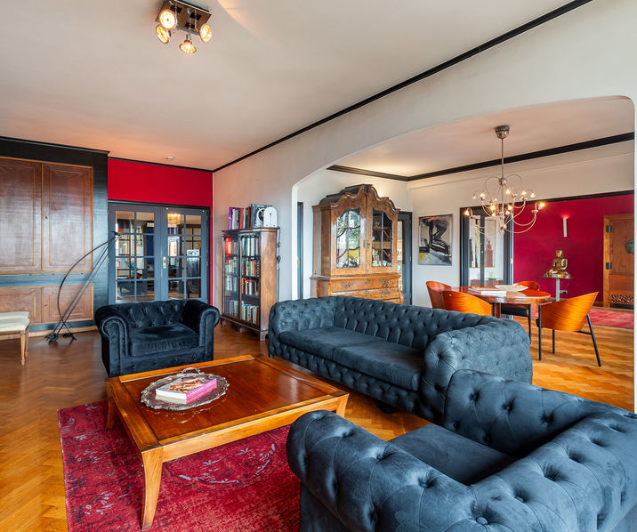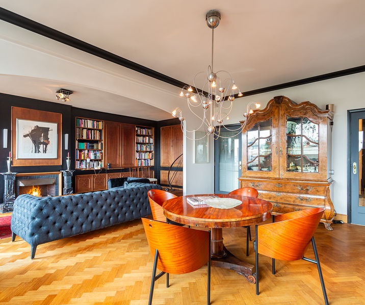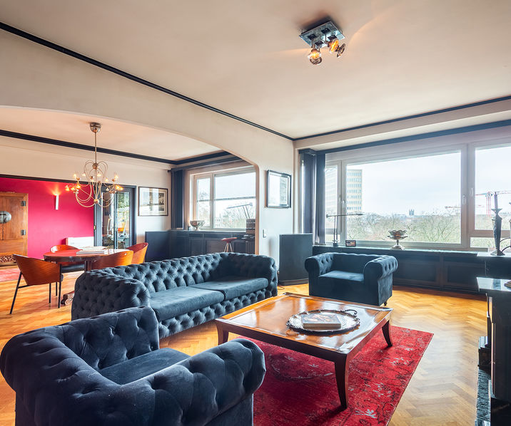 The place to be - a penthouse with a vieuw! Via de Art-Deco hal met 2 liften betreedt u het penthouse appartement van ca 265 mē op de 8e verdieping met een vrij uitzicht over het Koning Albertpark, de omliggende tuinen van het Provinciehuis en notarishuis als naaste buren. Inkomhal met ruime vestiaire en gastentoilet. De sfeervolle leefruimte biedt u de nodige rust en comfort, genieten van de schitterende bibliotheek met lambrisering en een gas open haard. De riante living op originele visgraatparket herbergt het salon, zitkamer, eetkamer.