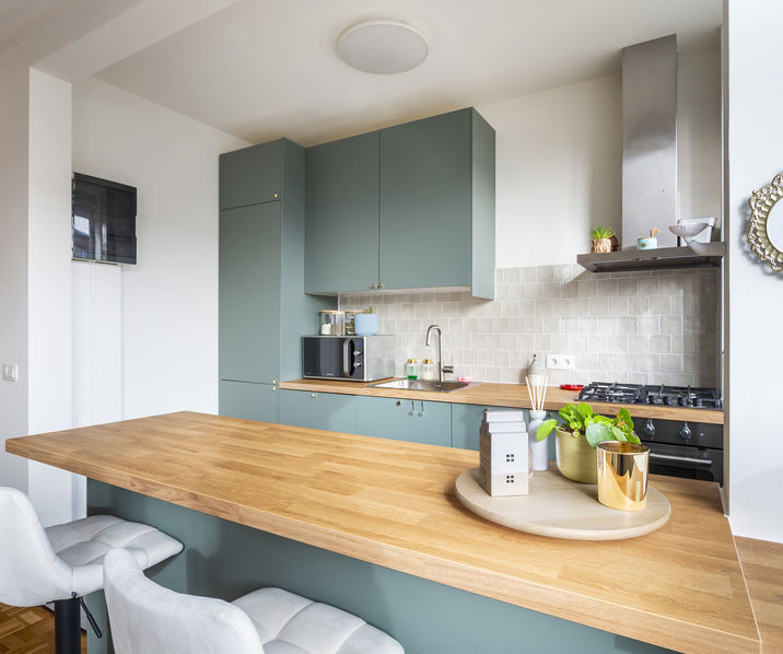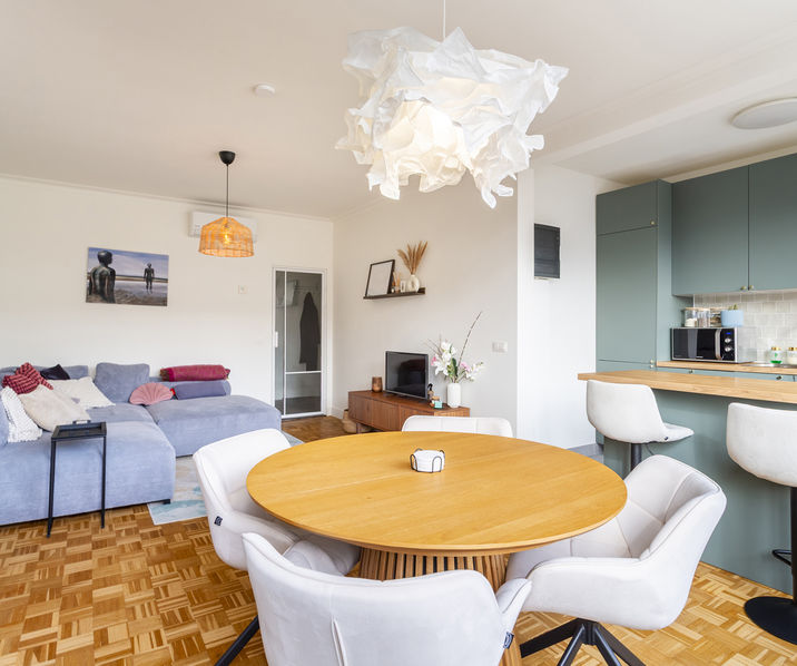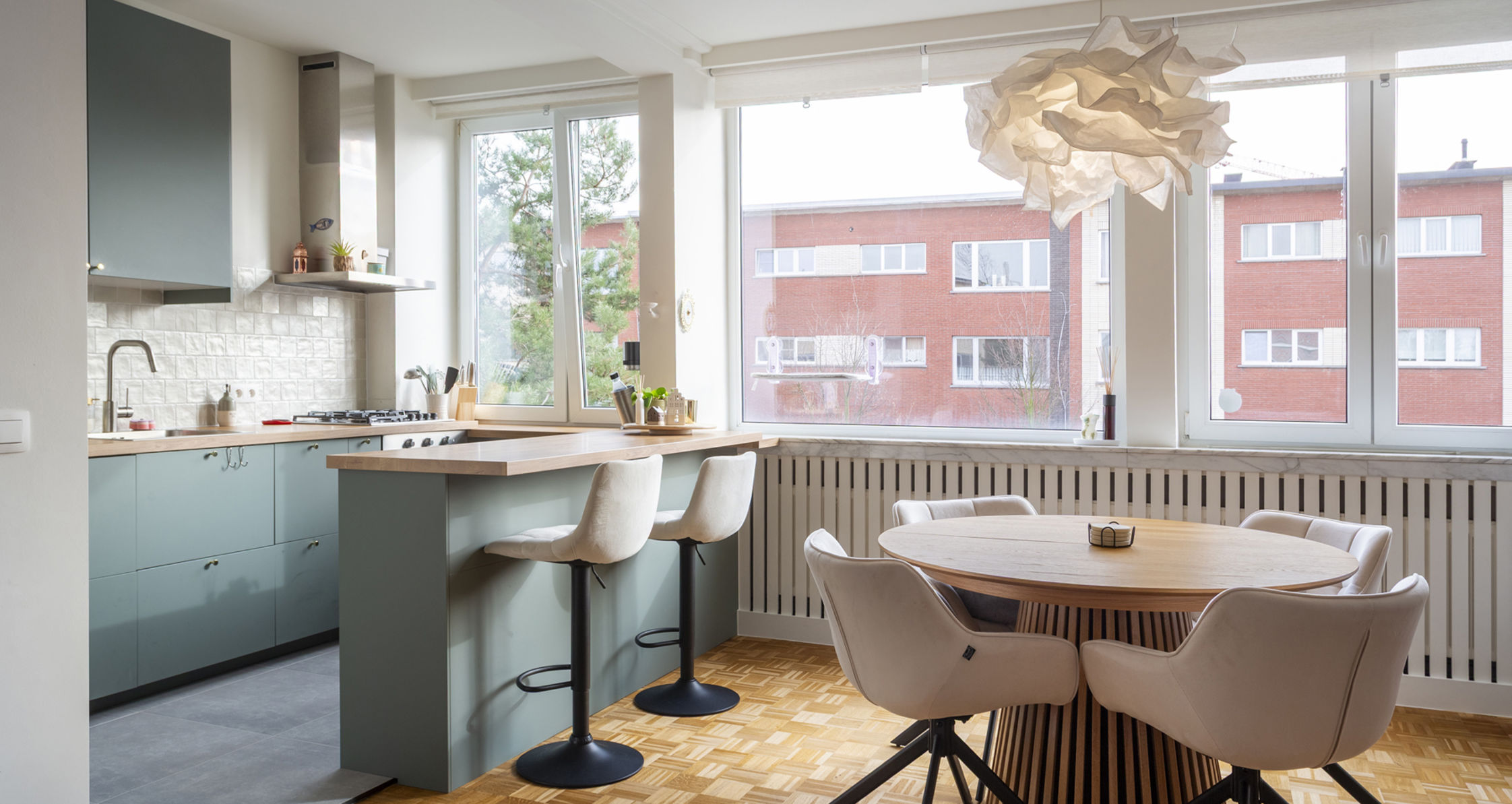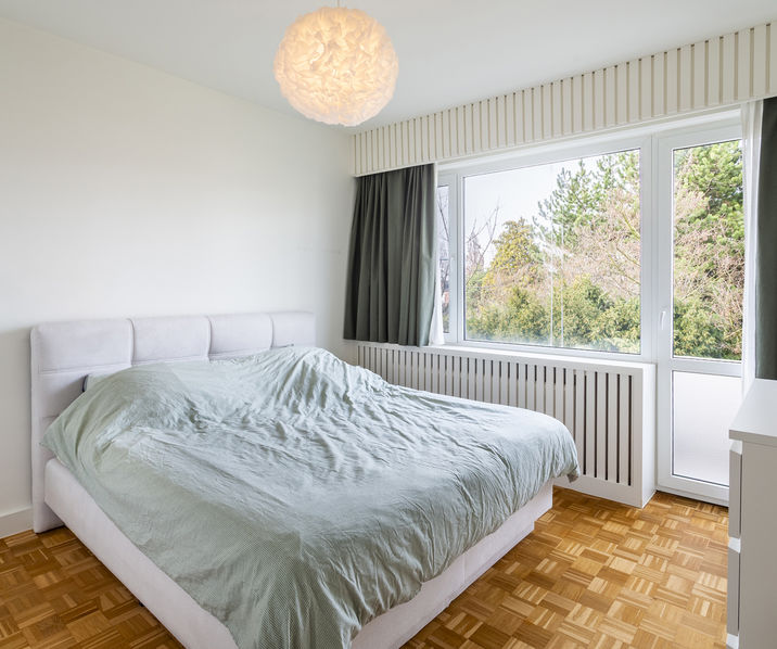 U komt binnen via de inkomhal, die alle ruimtes verbindt. Vervolgens geeft de smeedijzeren deur u toegang tot de aangename en bijzonder lichtrijke LEEFRUIMTE op parket, waar u geniet van een open groen uitzicht. Leefruimte is tevens uitgerust met een aircotoestel. De moderne open KEUKEN is voorzien van een ontbijthoek en tal van opbergkasten. Verder zijn alle toestellen voorzien; spoelbak, oven, een gasvuur, vaatwasser, ijskast en een diepvries.