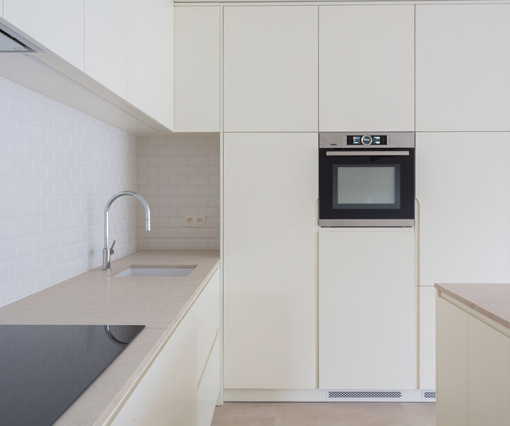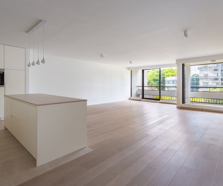 Ruime INKOMHAL met vestiaire en apart gastentoilet. De royale LEEFRUIMTE van ca. m² op parket biedt toegang tot het OOST-GEORIËNTEERDE TERRAS van ca. 22 m² over de volledige breedte van het appartement. De volledig ingerichte open KEUKEN beschikt over een kookeiland met ontbijthoek, opbergkasten en hoogwaardige toestellen.