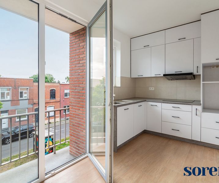 U komt binnen in de lichtrijke en ruime LEEFRUIMTE van ca. 51mē op, afgewerkt met stijlvolle keramische parket en kamerhoge raampartijen. Aansluitend bevindt zich de ingerichte KEUKEN van ca. 9mē, uitgerust met opbergkasten en volgende toestellen: een spoelbak, een inductiekookplaat en een dampkap. Via het grote raam heb je directe toegang tot het terrasje vooraan.