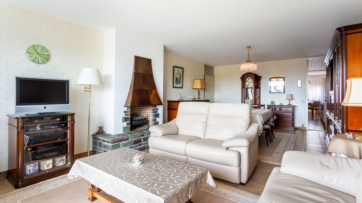 Een ruime en lichtrijke LIVING ca. 35m² met TERRAS ca. 6m². Ensuite de ingerichte KEUKEN ca. 13m² met ontbijthoek, opberkasten en toestellen; een kookplaat, dampkap, dubbele spoelbak, koelkast met diepvries en een oven