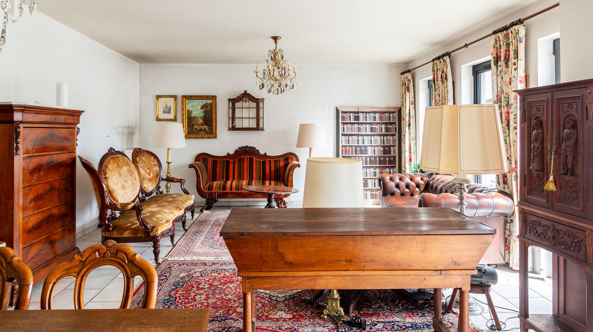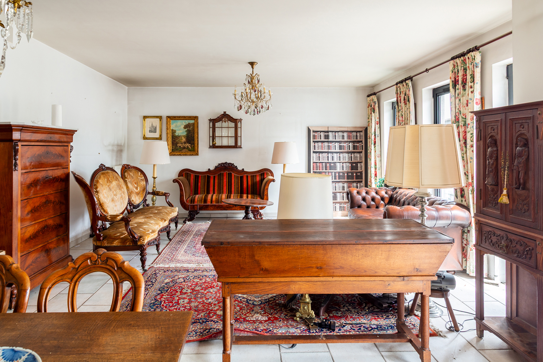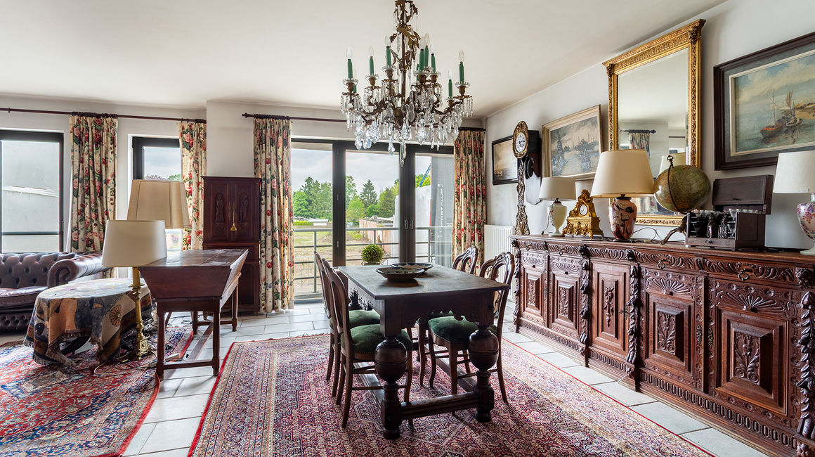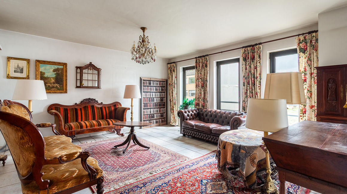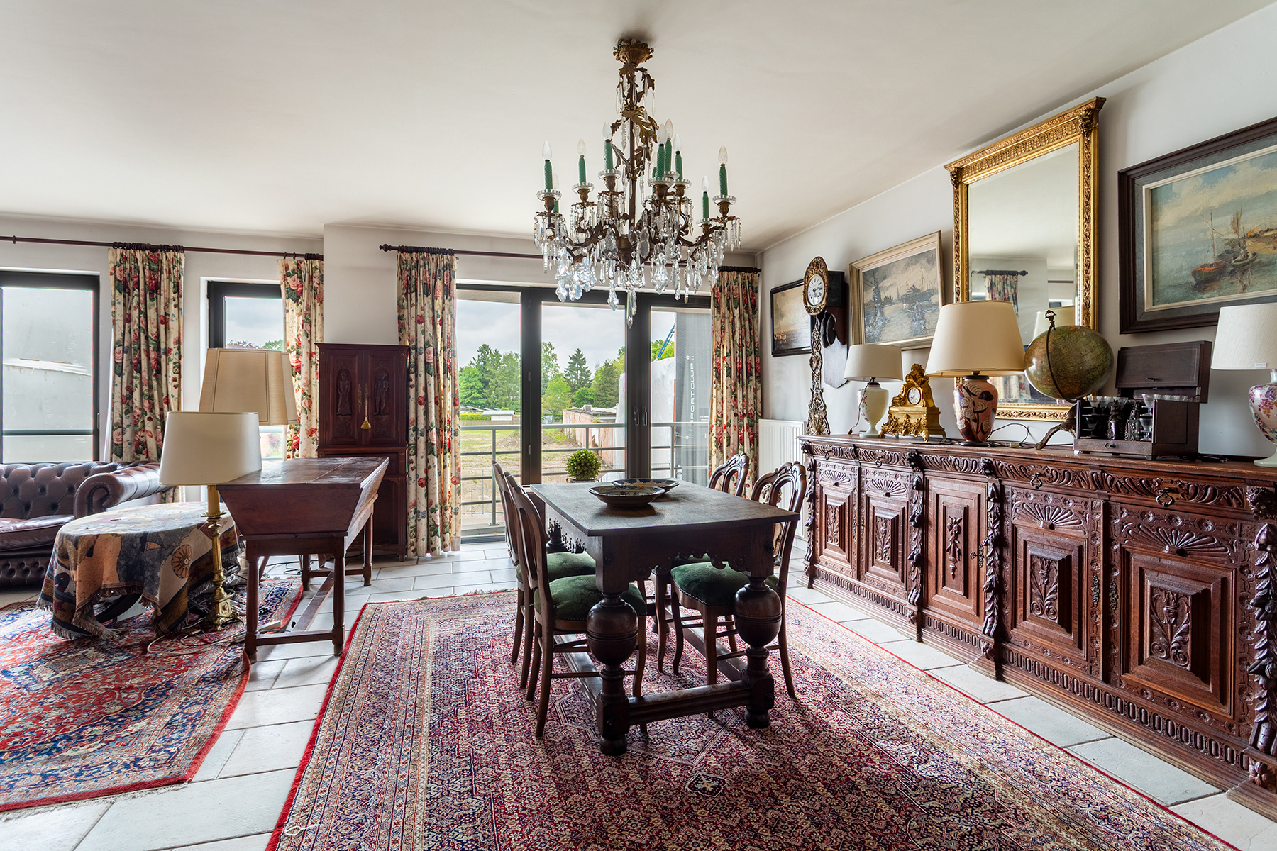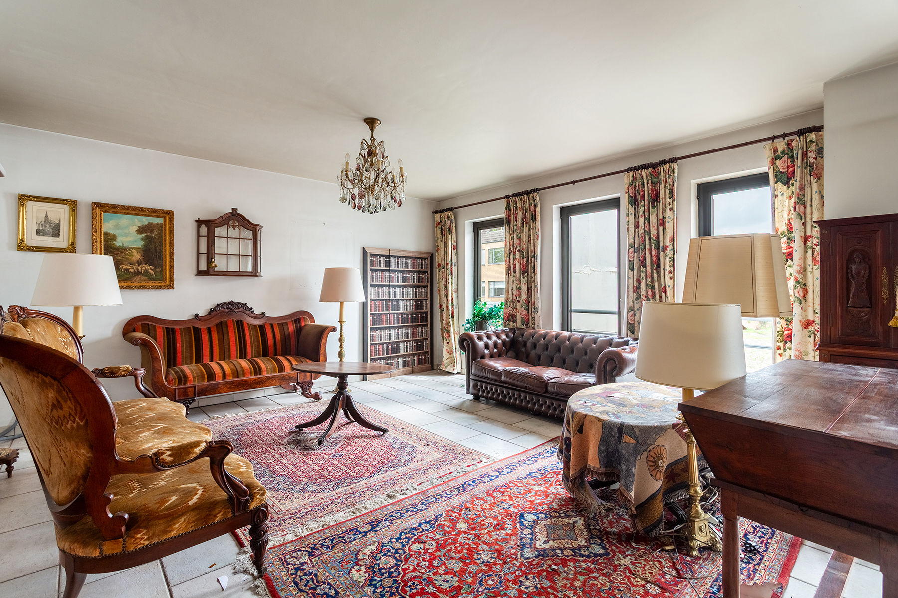 Met de lift bereikt men de eerste verdieping, waar men binnenkomt via de veiligheidsdeur in de ruime INKOMHAL op mooie bourgondische dals, die naadloos doorlopen naar de woonkamer. In de inkomhal bevindt zich tevens het toilet met handenwasser. Via moderne glazen deuren betreedt men de lichtrijke en aangename WOONKAMER (ca. 47m²), die dankzij de grote raampartijen aan de voorzijde veel lichtinval geniet en uitgeeft op een klein terras vooraan. De aparte KEUKEN (ca. 11m²) met ontbijthoek is bijzonder praktisch ingericht en uitgerust met opbergkasten en toestellen: koelkast, diepvries, oven, halogeen kookplaat, dampkap. In de keuken is er een opbergkast voorzien voor de plaatsing van uw wasmachine en droogkast.