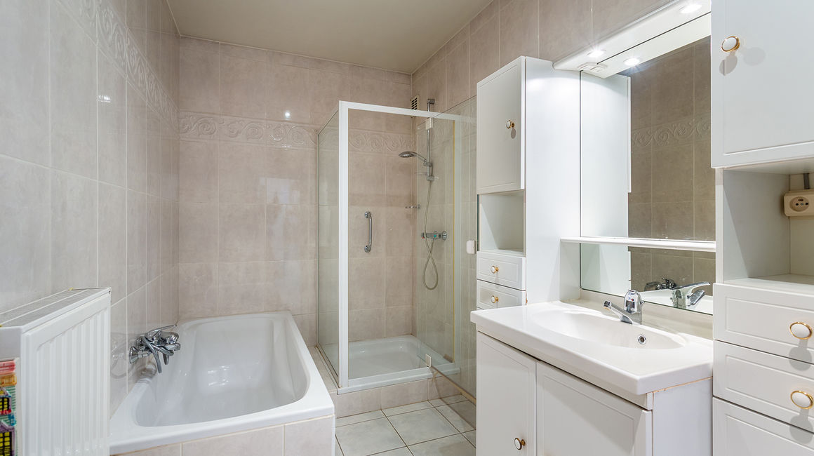 Achteraan het appartement bevinden zich drie SLAAPKAMERS (ca. 14,3m², 13,6m² en 7,6m²), waarvan de master bedroom en de kleinste kamer directe toegang bieden tot het sublieme TERRAS van ca. 65m². De BADKAMER (ca. 7,6 m²) is uitgerust met een lavabo in een meubel, een ligbad, een toilet en een douche.