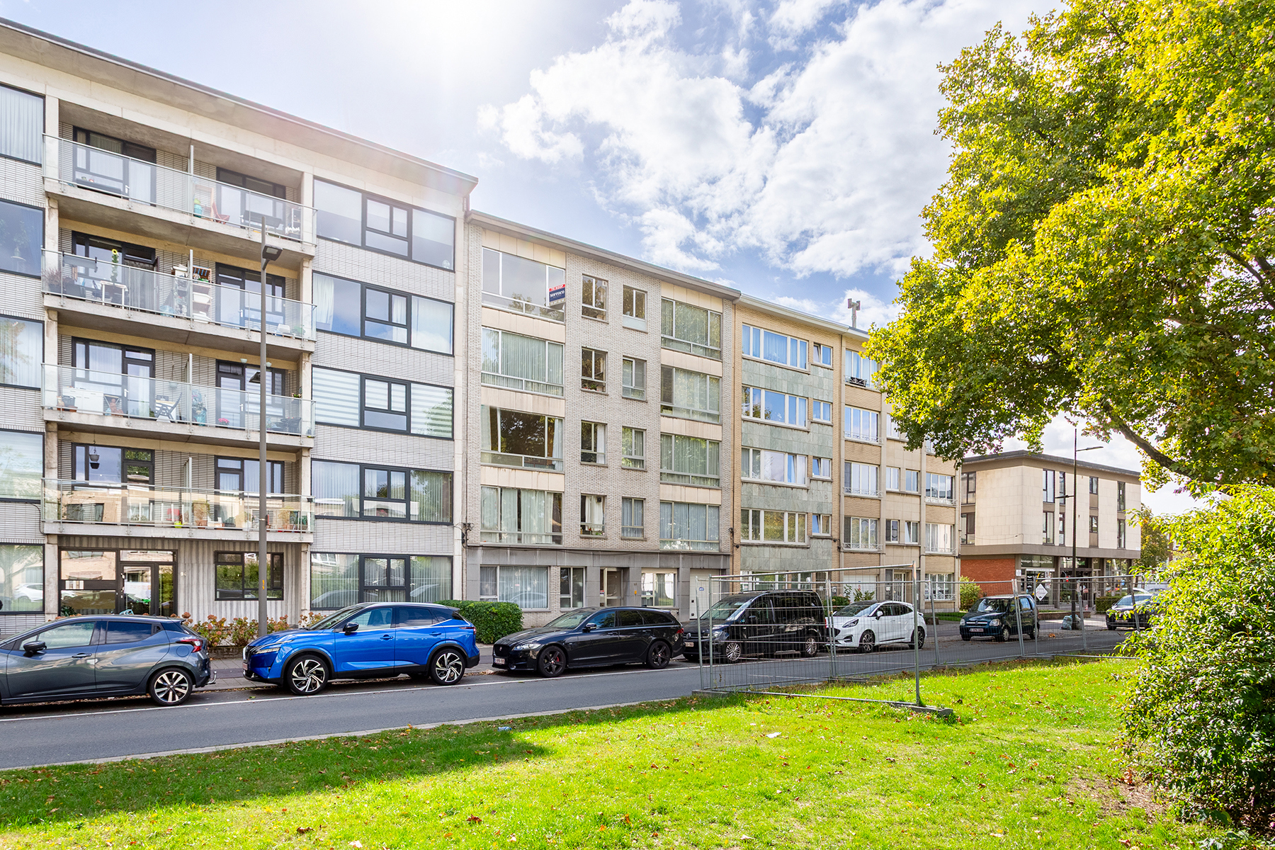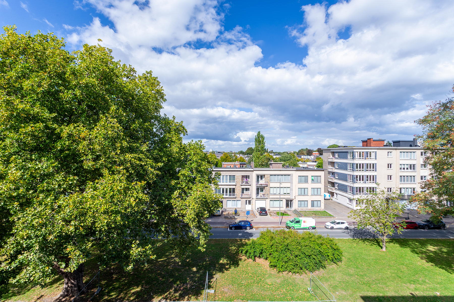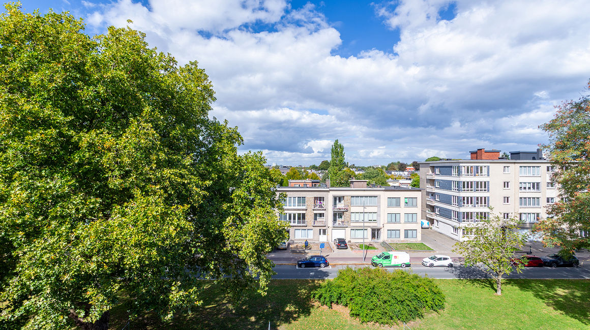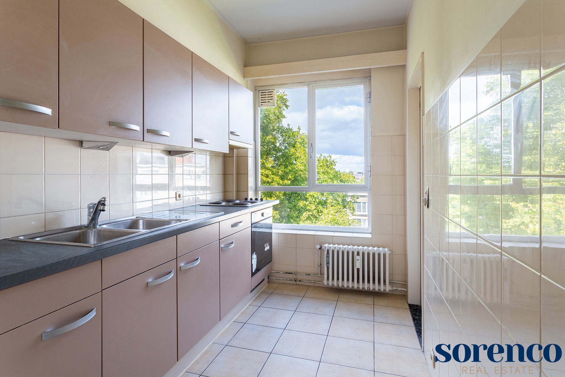 De centrale INKOMHAL met grote ingemaakte kasten en apart gastentoilet geeft toegang tot alle ruimtes en zorgt meteen voor een praktische indeling. De gezellige LIVING ca. 31m² op authentieke parket geniet van veel natuurlijk licht vanwaar u geniet van een wijds uitzicht over de Ringlaan en het groen. Aansluitend de KEUKEN ca. 8m², uitgerust met opbergkasten en toestellen: wastafel, elektrische kookplaat, dampkap en oven.