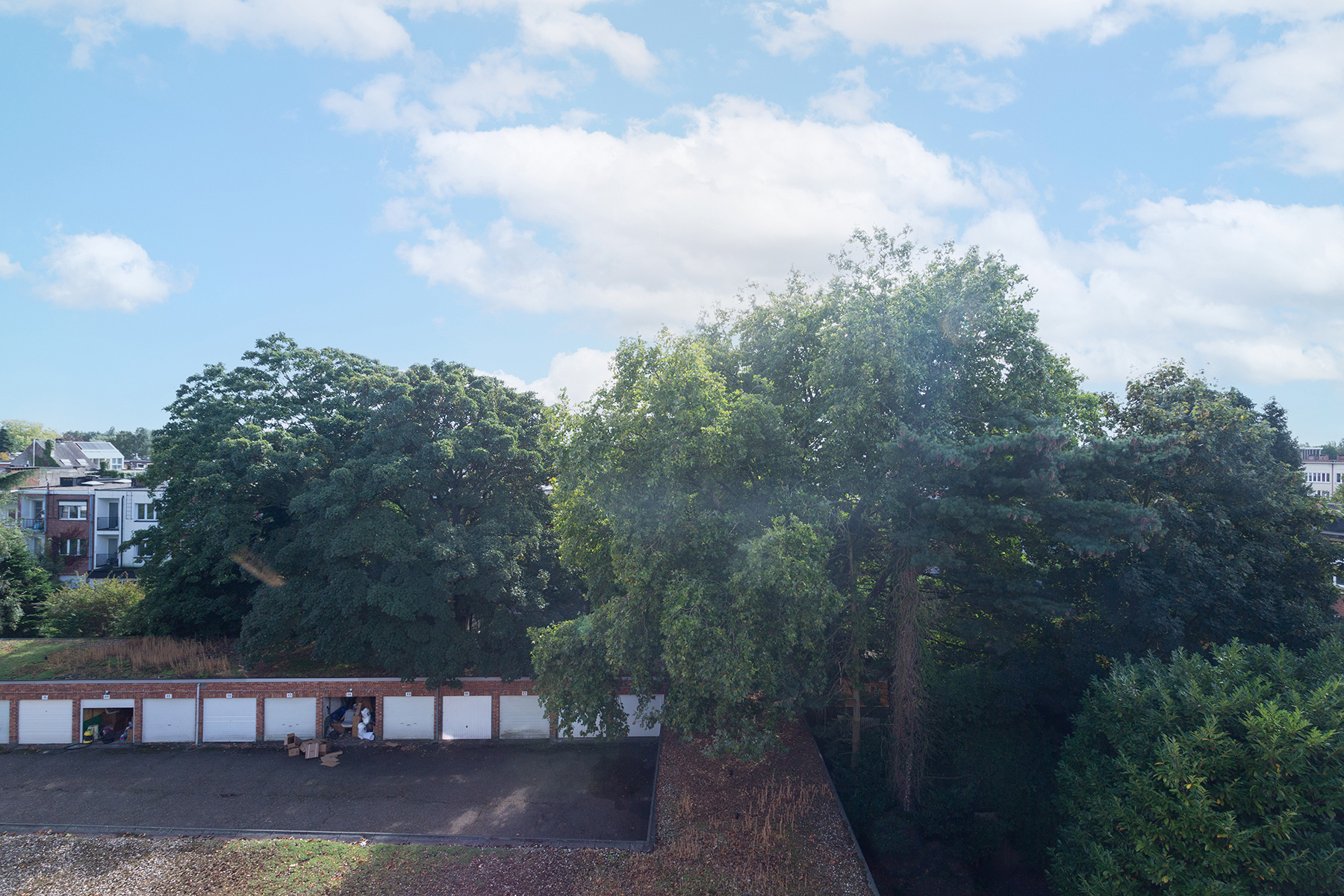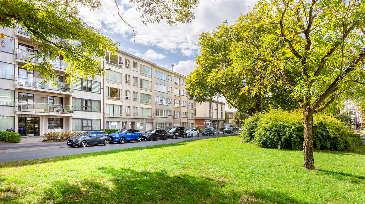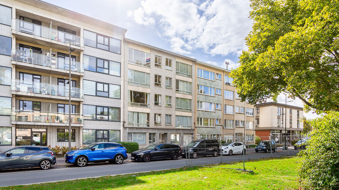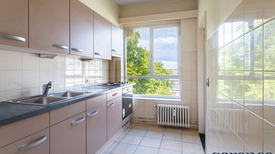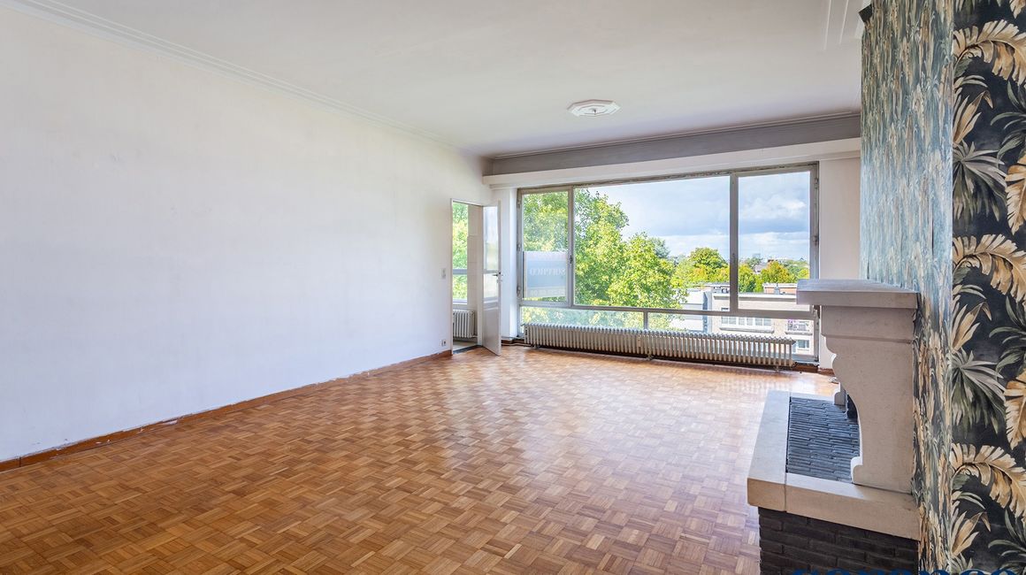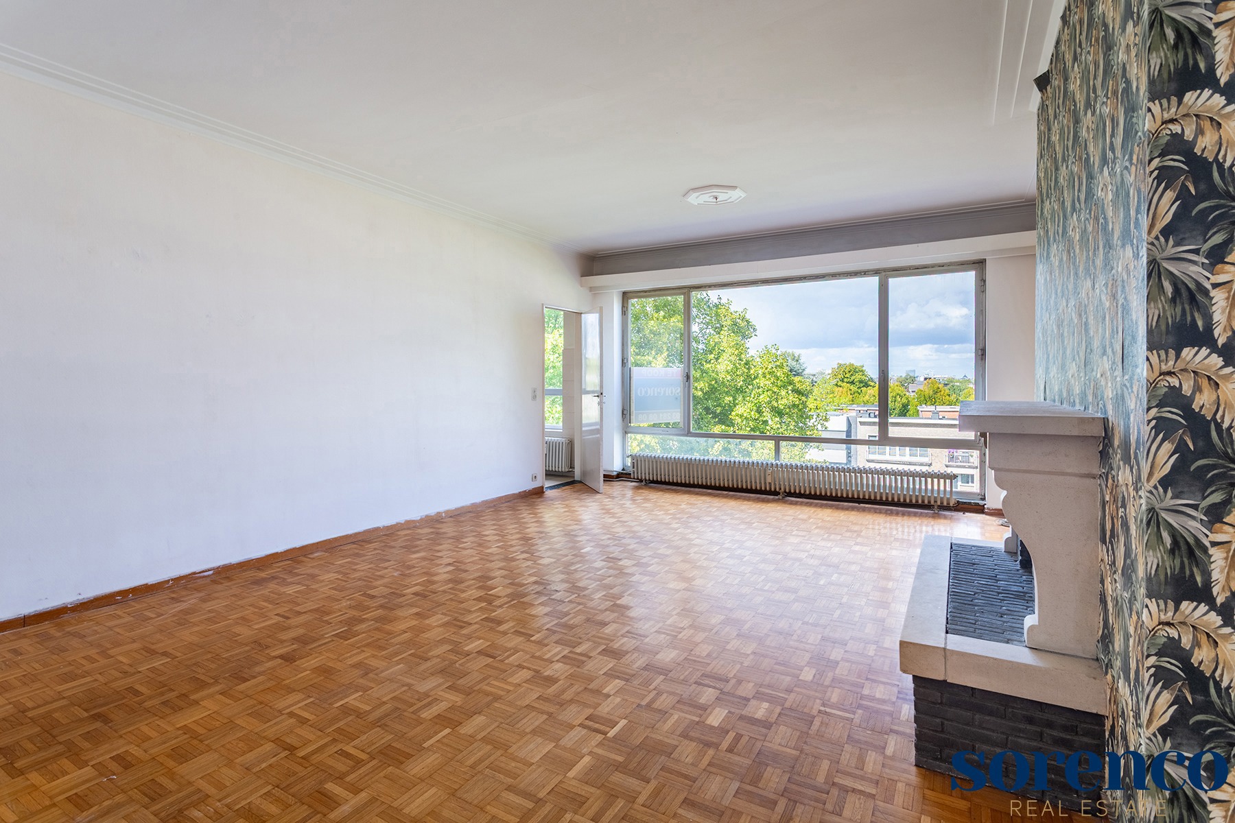 De centrale INKOMHAL met grote ingemaakte kasten en apart gastentoilet geeft toegang tot alle ruimtes en zorgt meteen voor een praktische indeling. De gezellige LIVING ca. 31m² op authentieke parket geniet van veel natuurlijk licht vanwaar u geniet van een wijds uitzicht over de Ringlaan en het groen. Aansluitend de KEUKEN ca. 8m², uitgerust met opbergkasten en toestellen: wastafel, elektrische kookplaat, dampkap en oven.