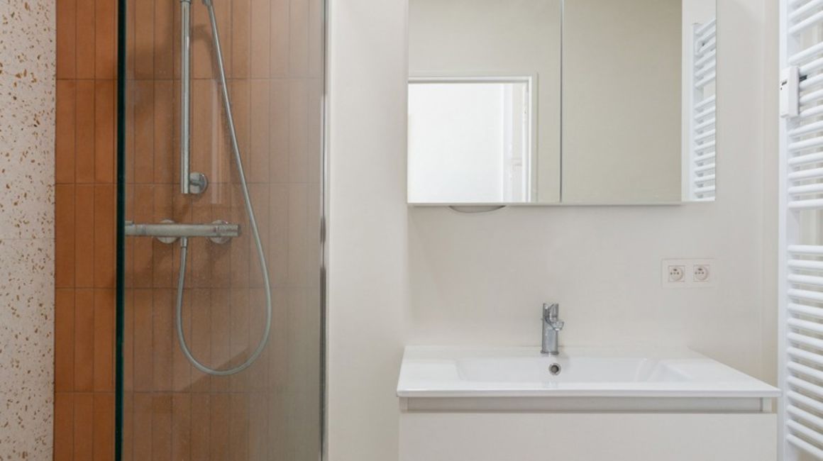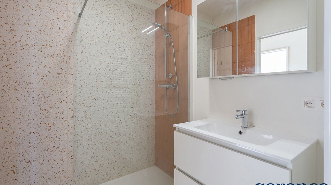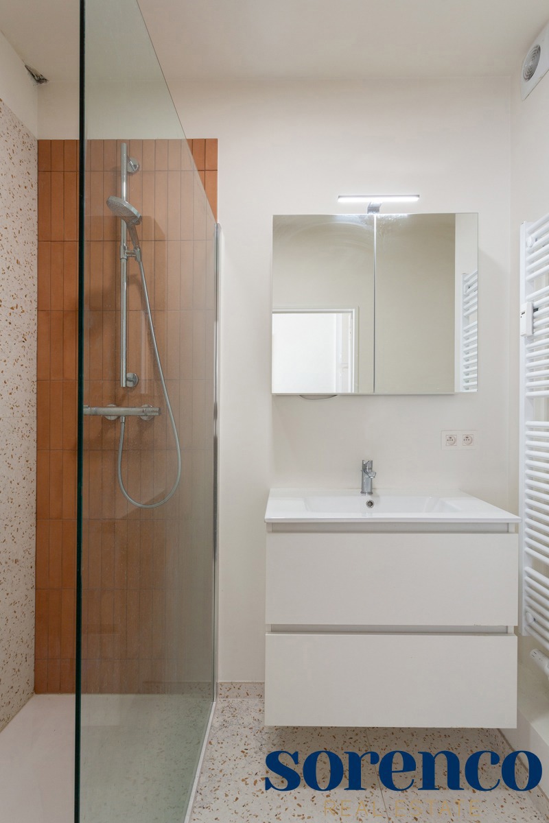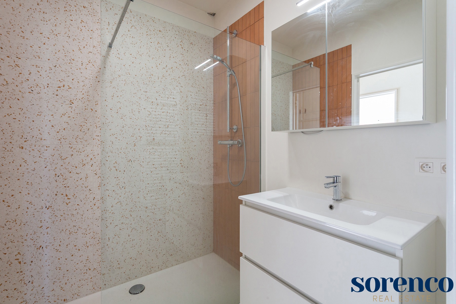 De vernieuwde BADKAMER ca. 4m² is ingericht met een inloopdouche, modern wasmeubel en aansluitingen voor wasmachine en droogkast. Daarnaast zijn er twee extra SLAAPKAMERS ca. 10m² en ca. 18,5m². Vanuit de grootste slaapkamer heeft u toegang tot het zonnige TERRAS achteraan ca. 4,5m² met ingemaakte opbergkast, een fijne buitenruimte om tot rust te komen.