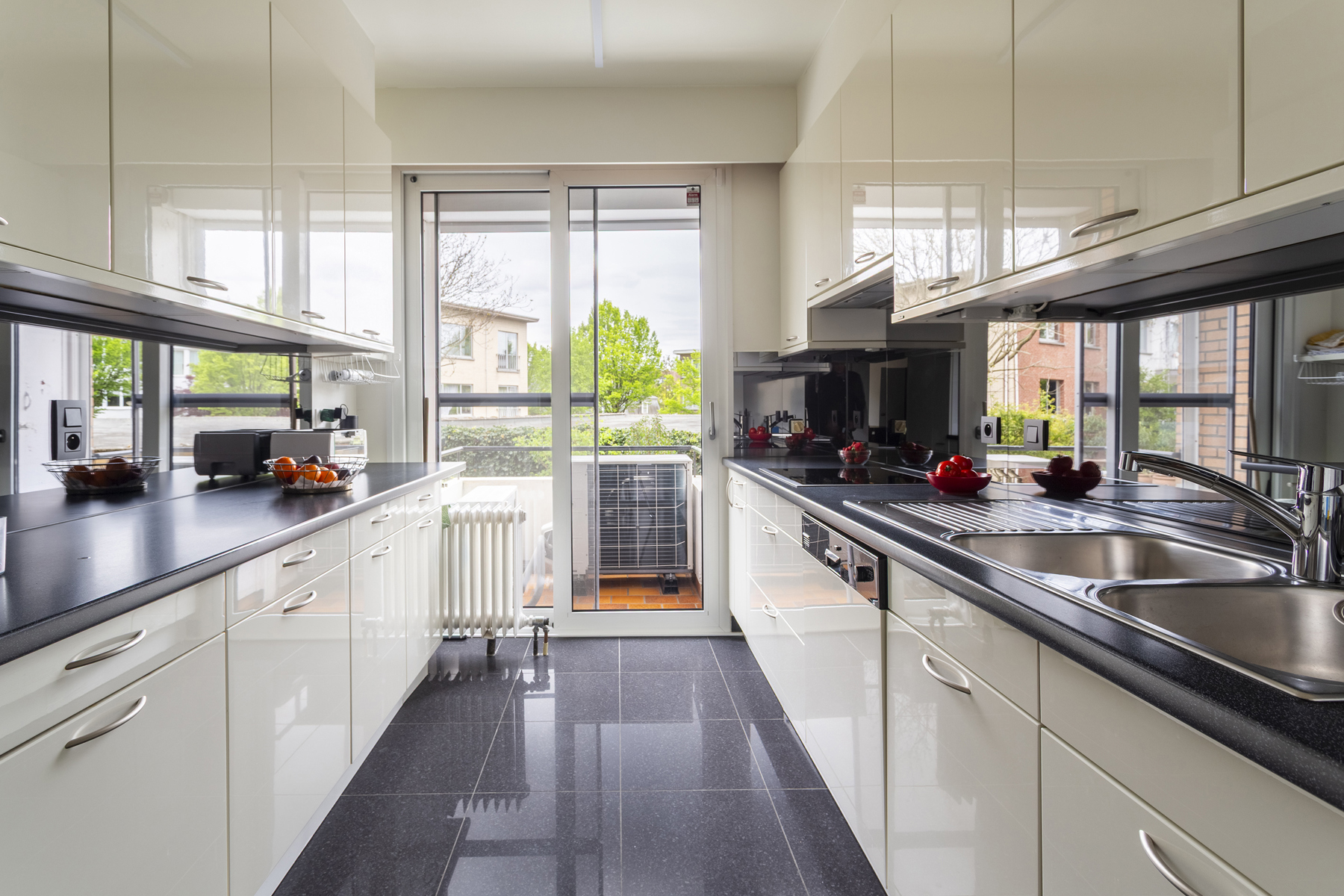 De volledig nieuw ingerichte keuken ca. 17m² (6,51m x 2,48m) beschikt over kasten aan beide zijden en moderne toestellen, waaronder een ijskast met diepvries, inductiekookplaat, oven, vaatwasser, dubbele lavabo en werkblad aan beide zijden. Aangrenzend vindt u een klein terras voorzien van rolluiken.