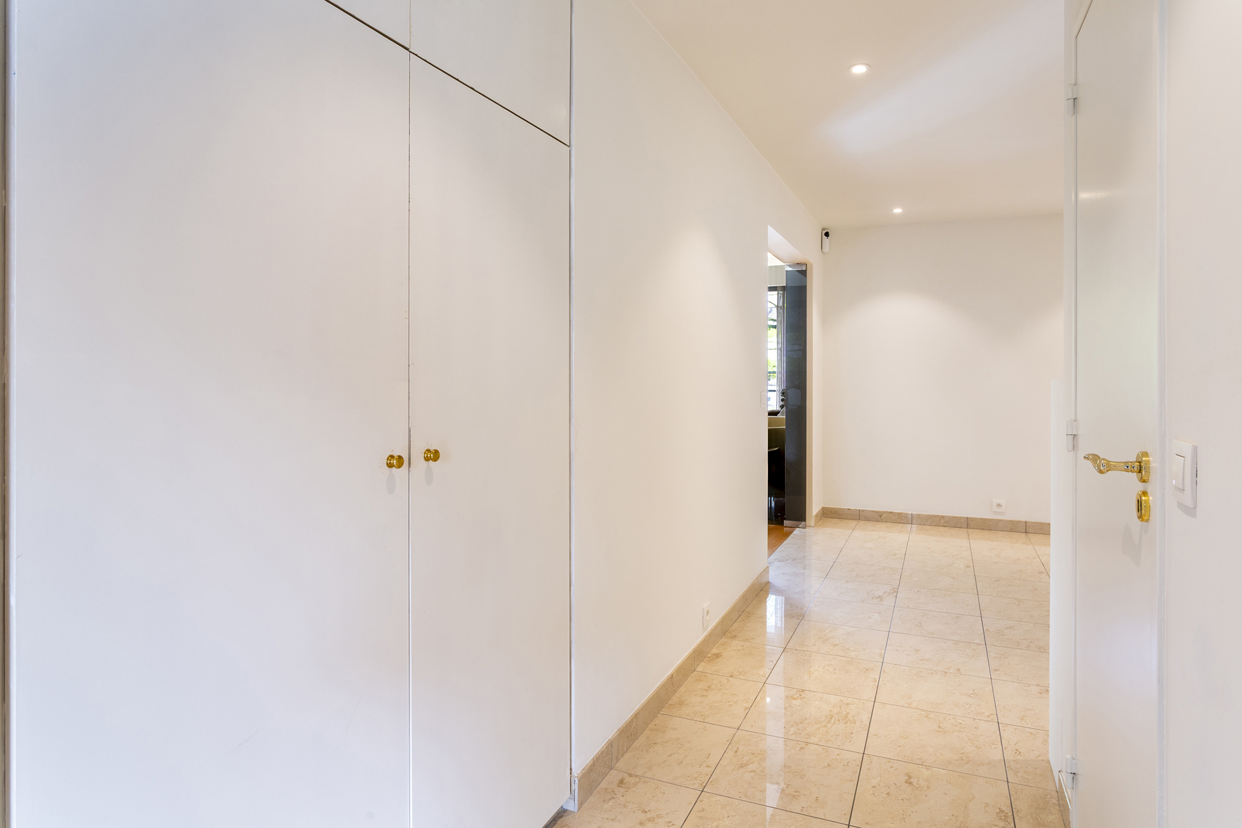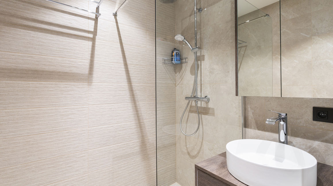 Er zijn twee volledig vernieuwde badkamers op beige keramische tegels. De hoofdbadkamer beschikt over een inloopdouche, wastafel en toilet, terwijl de tweede badkamer voorzien is van inloopdouche, wastafel, toilet en aansluitingen voor een wasmachine.