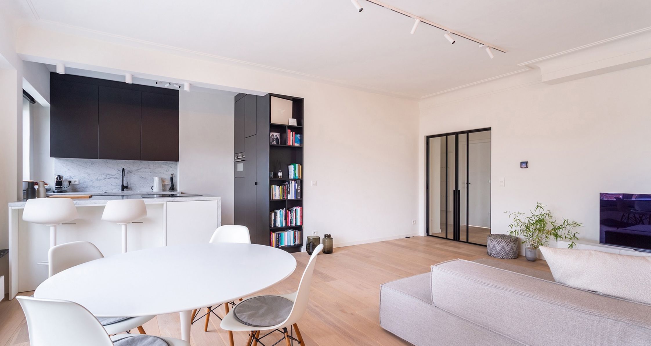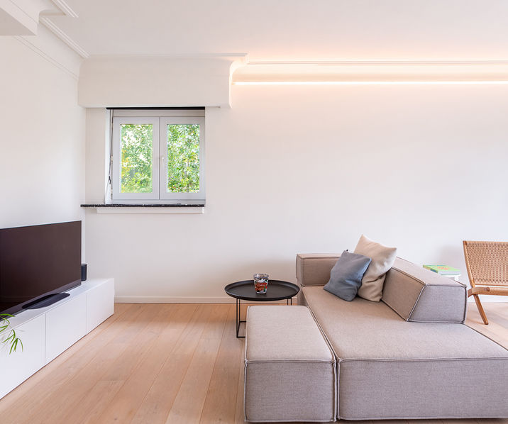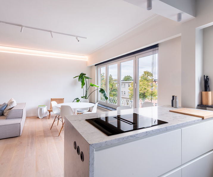 De centrale INKOMHAL geeft toegang tot alle ruimtes. Via de stalen deur betreden we de ruime en lichtrijke LIVING van ca. 32mē op parket. En suite bevindt zich de OPEN KEUKEN van ca. 6mē, voorzien van alle comfort zoals een inductiekookplaat met ingebouwd afzuigsysteem op het kookeiland, een combi microgolfoven, een afwasmachine en een wastafel. De keuken is hoogwaardig afgewerkt met carrara-finishing en uitgerust met kwaliteitstoestellen.
