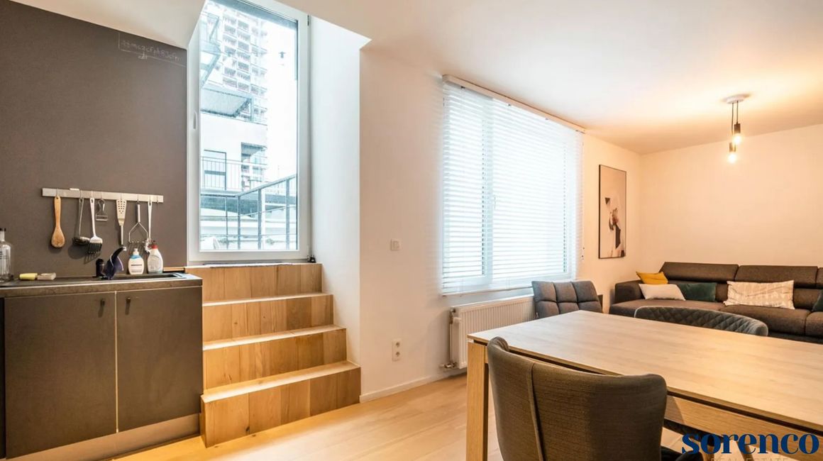 GEMEUBELD Zeer licht 1 slaapkamer appartement ca. 75m² op parket met ruim terras gelegen in een kleinschalig gebouw in een trendy buurt in hartje Antwerpen nabij Stadsschouwburg, Hopland, Meir, diverse hippe kledingwinkels en trendy restaurants, Opera Antwerpen, Stadspark, Centraal Station, openbaar vervoer.