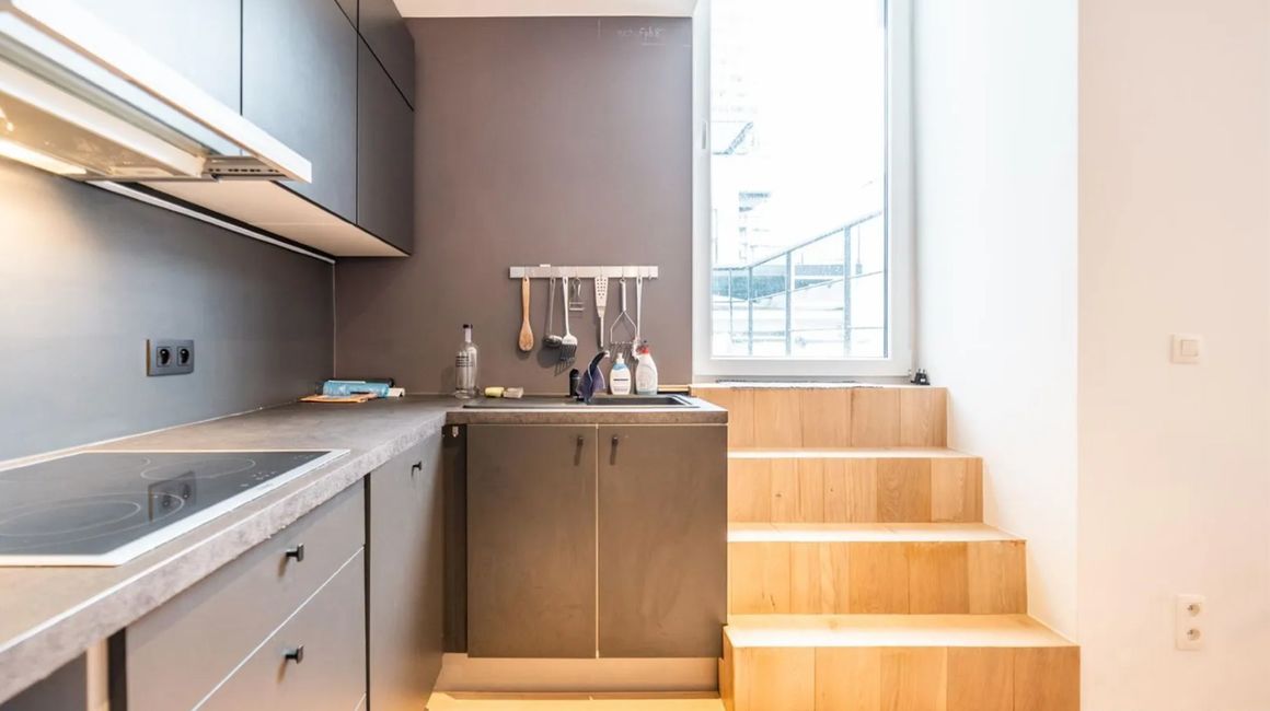 Via de trap komt u terecht in de gezellige LEEFRUIMTE met een open KEUKEN. De keuken is voorzien van opbergkasten en is volledig geïnstalleerd (ijskast, vriezer, vaatwasser, oven, spoelbak, kookplat, dampkap, ...)
