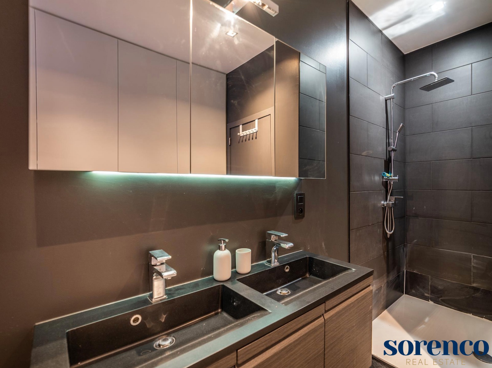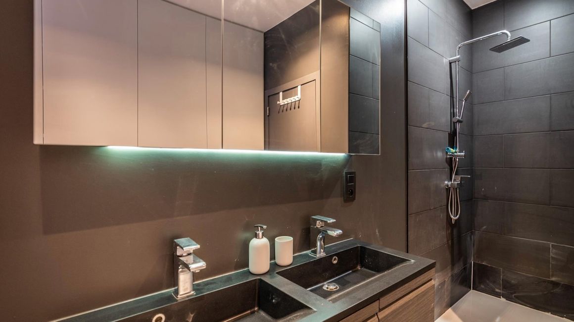 U komt binnen in een ruime INKOMHAL met apart toilet en een vestiaire. Verder heeft u een ruime SLAAPKAMER met ingebouwde kasten en een aanpalende BADKAMER voorzien van dubbele wastafel in meubel en een grote inloop douche.