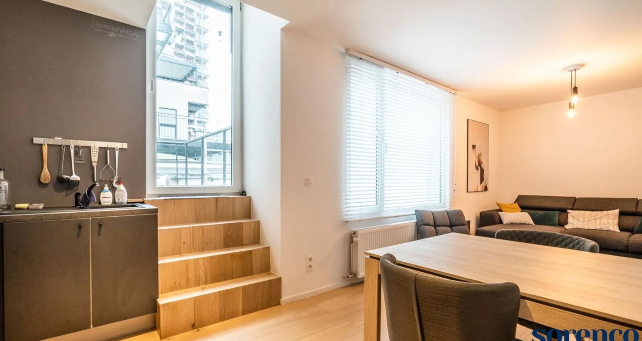 Via de trap komt u terecht in de gezellige LEEFRUIMTE met een open KEUKEN. De keuken is voorzien van opbergkasten en is volledig geïnstalleerd (ijskast, vriezer, vaatwasser, oven, spoelbak, kookplat, dampkap, ...)