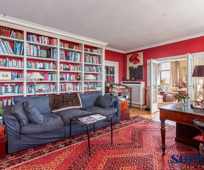 U komt binnen in de ruime INKOMHAL die toegang geeft tot de stijlvolle EETRUIMTE van ca. 38m² en de aangrenzende ZITRUIMTE van ca. 40m², beide afgewerkt met parketvloeren. Aansluitend bevindt zich het BUREAU van ca. 15m², eveneens op parket.