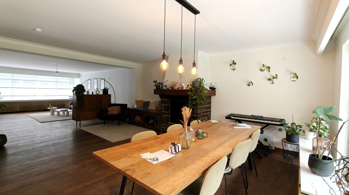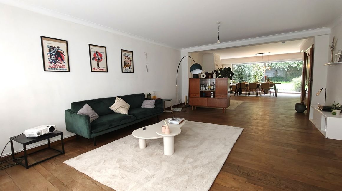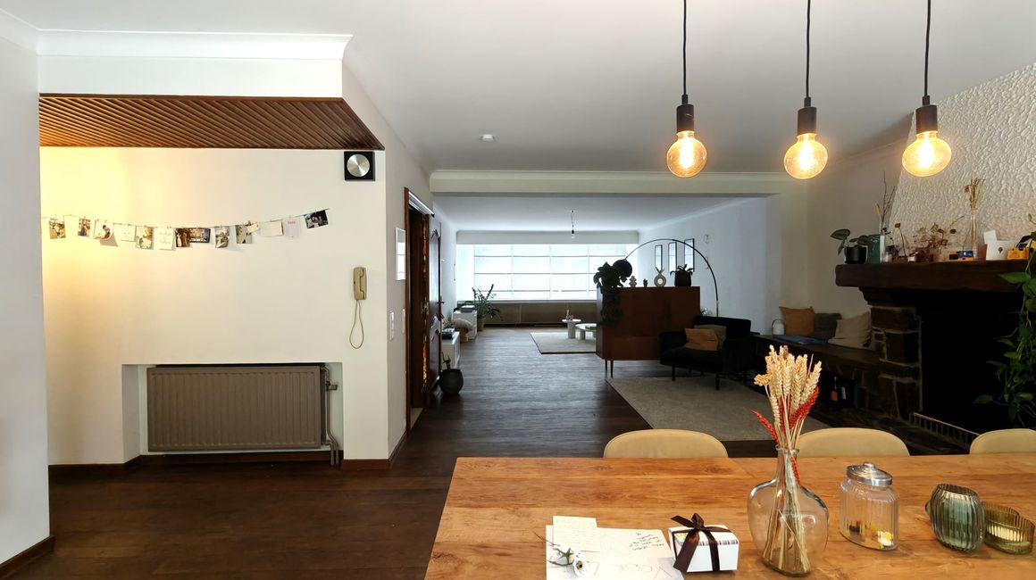 Inkomhal met apart gastentoilet en vestiaire. Riante en lichtrijke leefruimte op parketvloer ca. 13m x 6m met sierhaard, het schuifraam geeft u toegang tot het terras en de uitzonderlijke tuin.