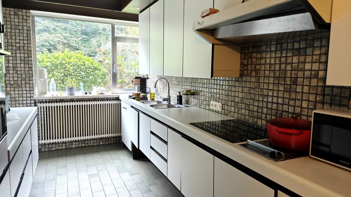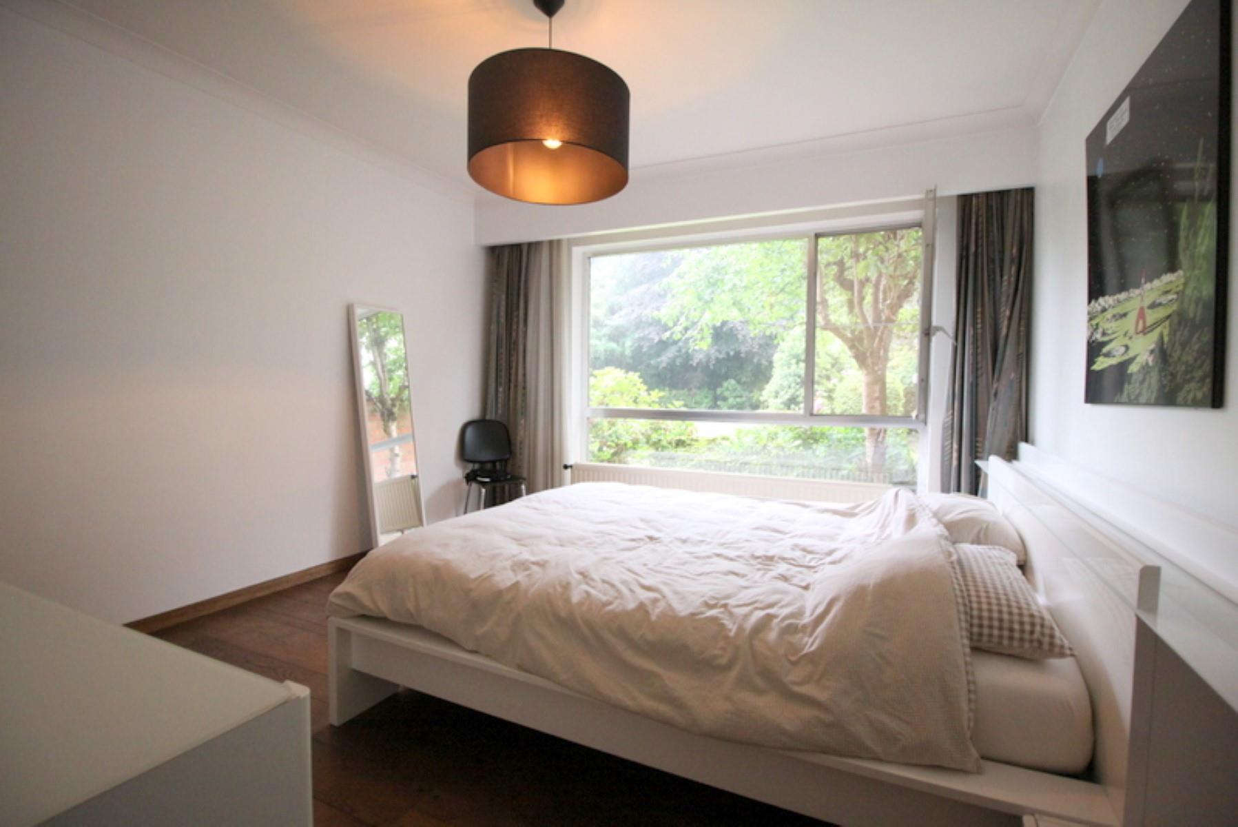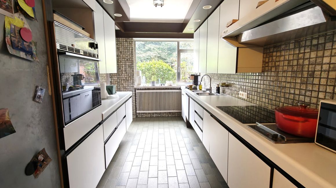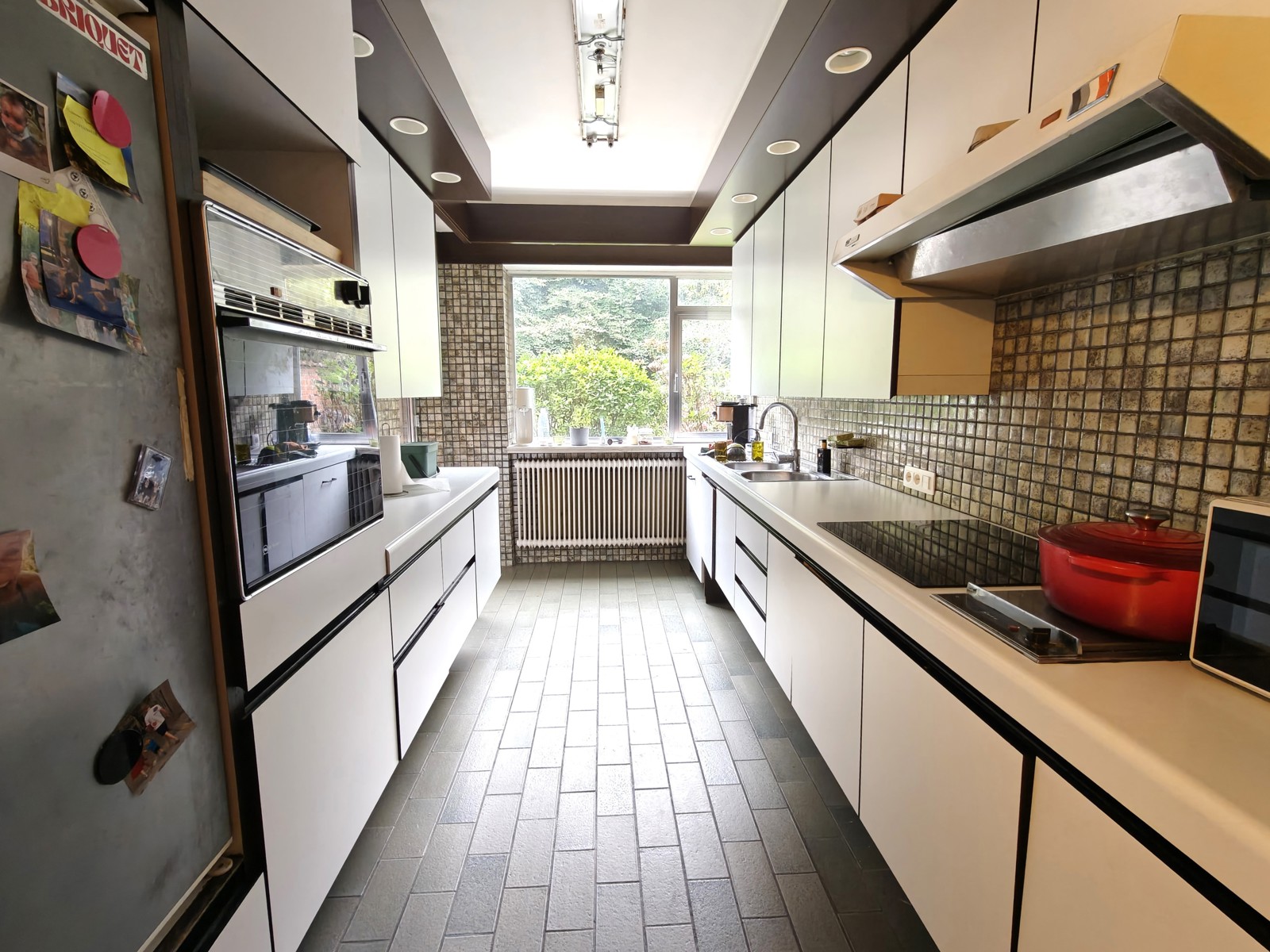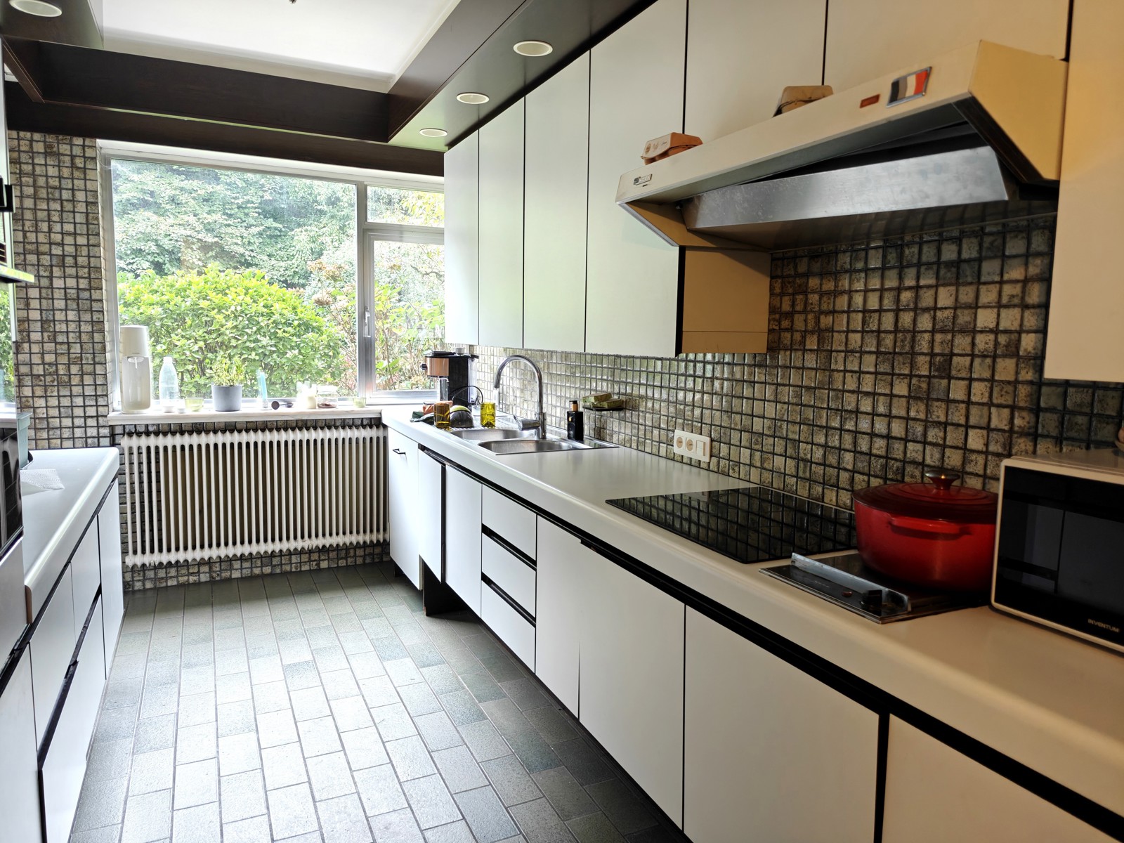 Volledig ingerichte aparte keuken ca. 2m x 4m met talrijke opbergkasten en toestellen, eveneens met directe toegang tot het terras en de tuin. Aparte slaapkamer op parket ca. 3,6m x 4m met aansluitend een ingerichte badkamer ca. 2m x 3m, voorzien van ligbad, douche en dubbele lavabo in een meubel.