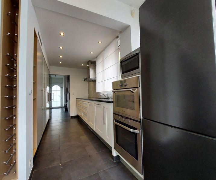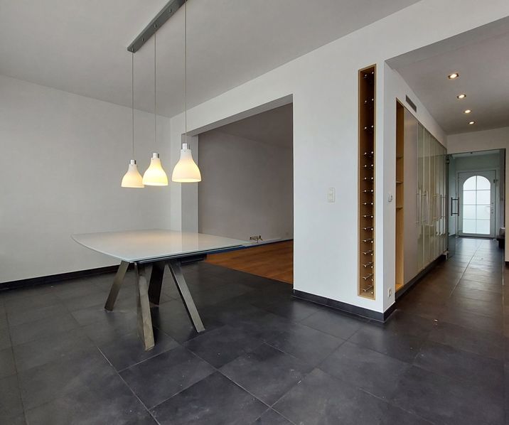 Bij binnenkomst betreedt u een ruime inkomhal met vestiaire en een apart gastentoilet. Via een dubbele deur komt u in de LIVING op parket, die aansluit op de ruime EETKAMER met tegelvloer. Aansluitend bevindt zich de KEUKEN, eveneens op tegelvloer, volledig uitgerust met opberkasten en toestellen; een dampkap, kookplaten (Siemens), spoelbak, afwasmachine (AEG), ijskast met diepvriesvak, oven, ingebouwde spots.