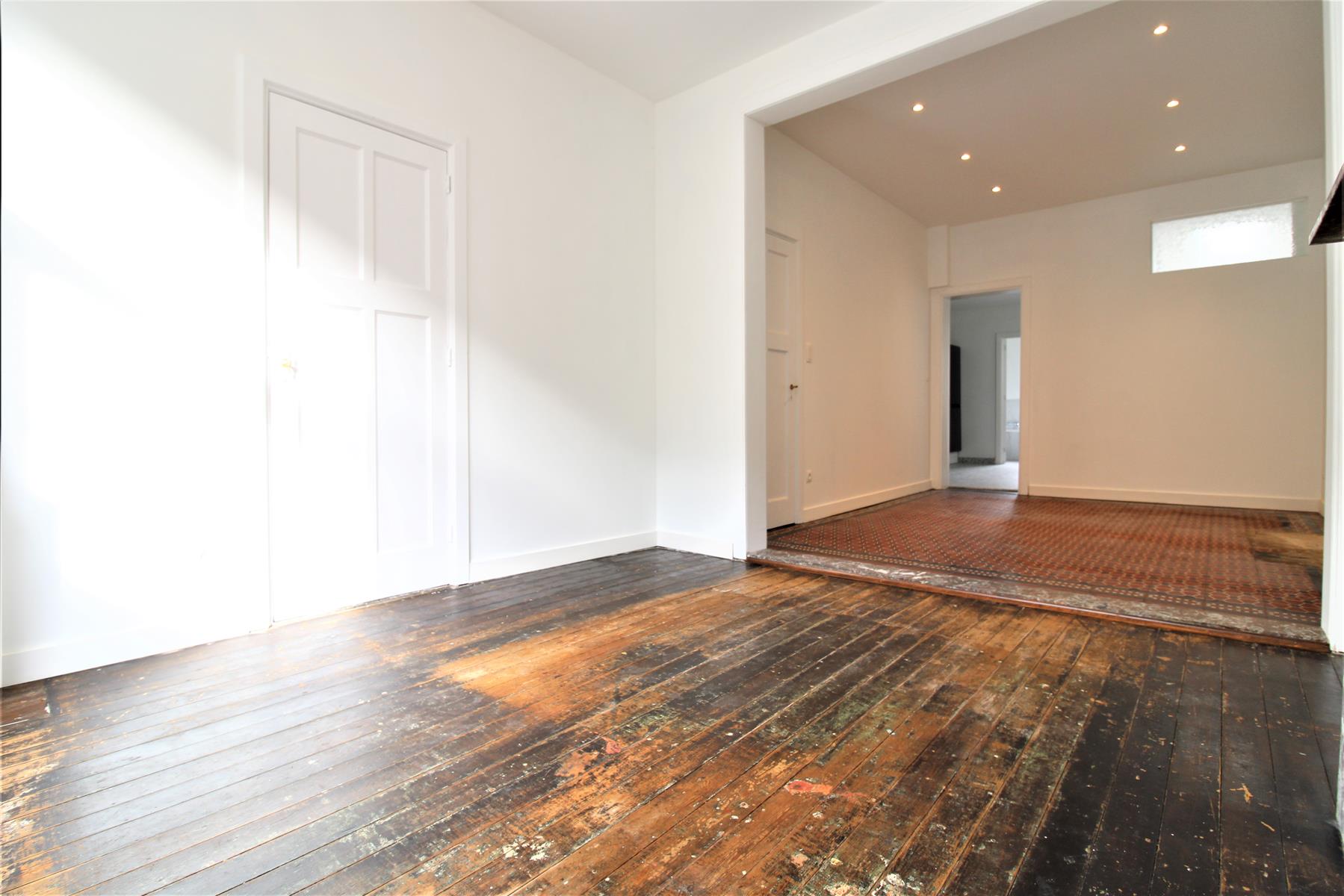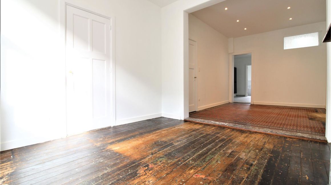 De ruime WOONKAMER (ca. 8m x 3,1m) is voorzien van authenieke elementen; houten vloer, marmeren sierschouw en hoge plafonds.