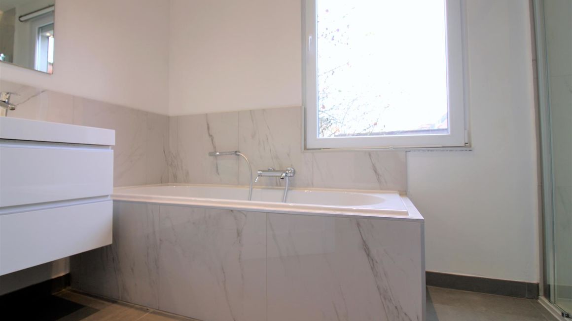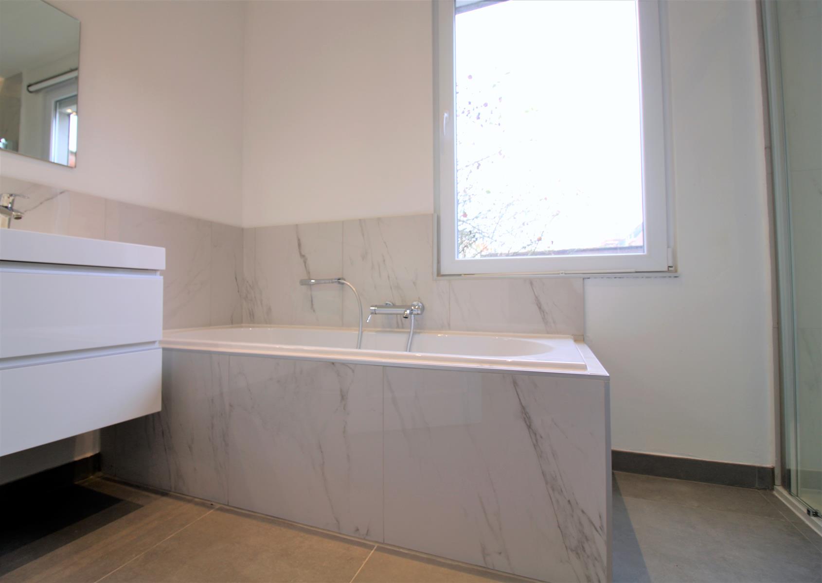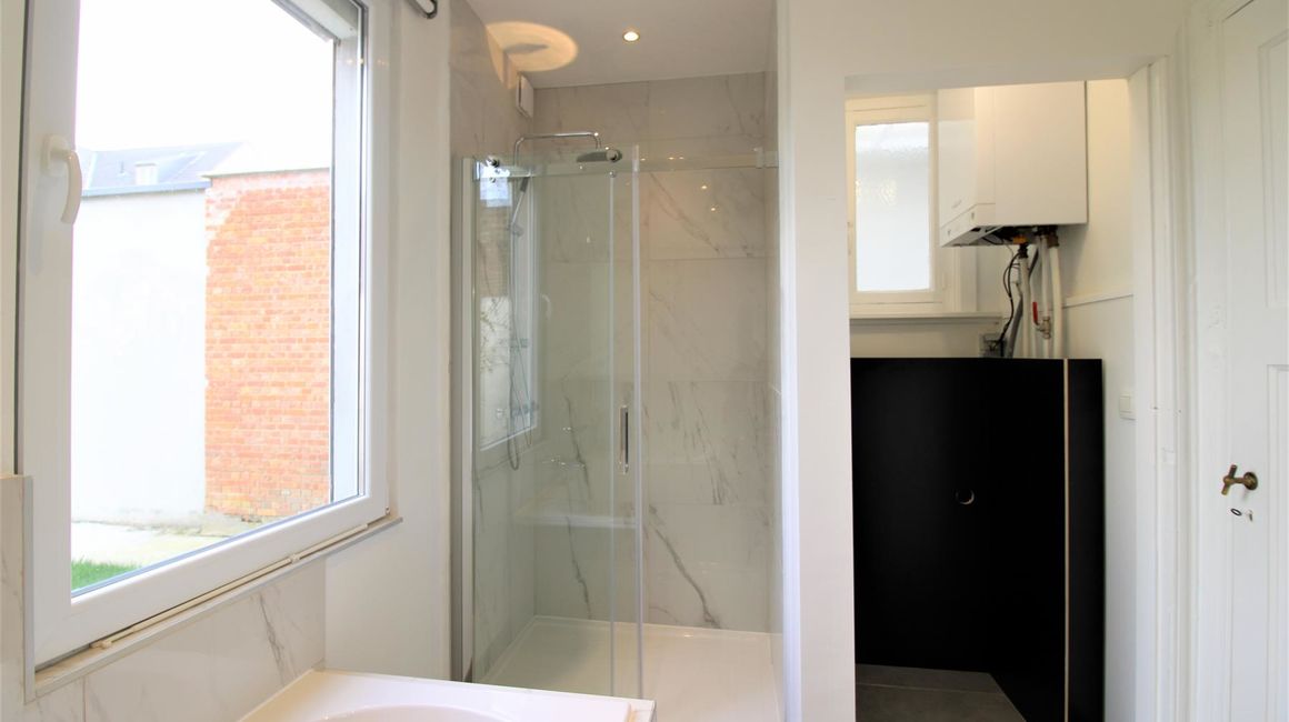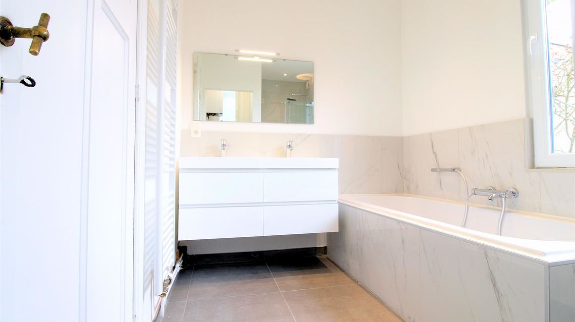 De ingerichte BADKAMER (ca. 3,4 x 2,2m), die ook gelegen is op de gelijkvloers verdieping, beschikt over een dubbele lavabo in een meubel, handdoekdroger, ligbad en een ruime regen douche. Aansluitingen voor wasmachine en droogkast zijn hier aanwezig.