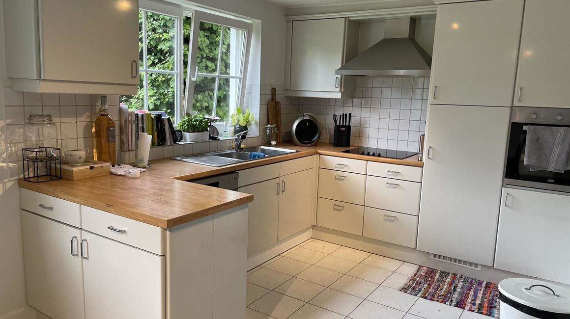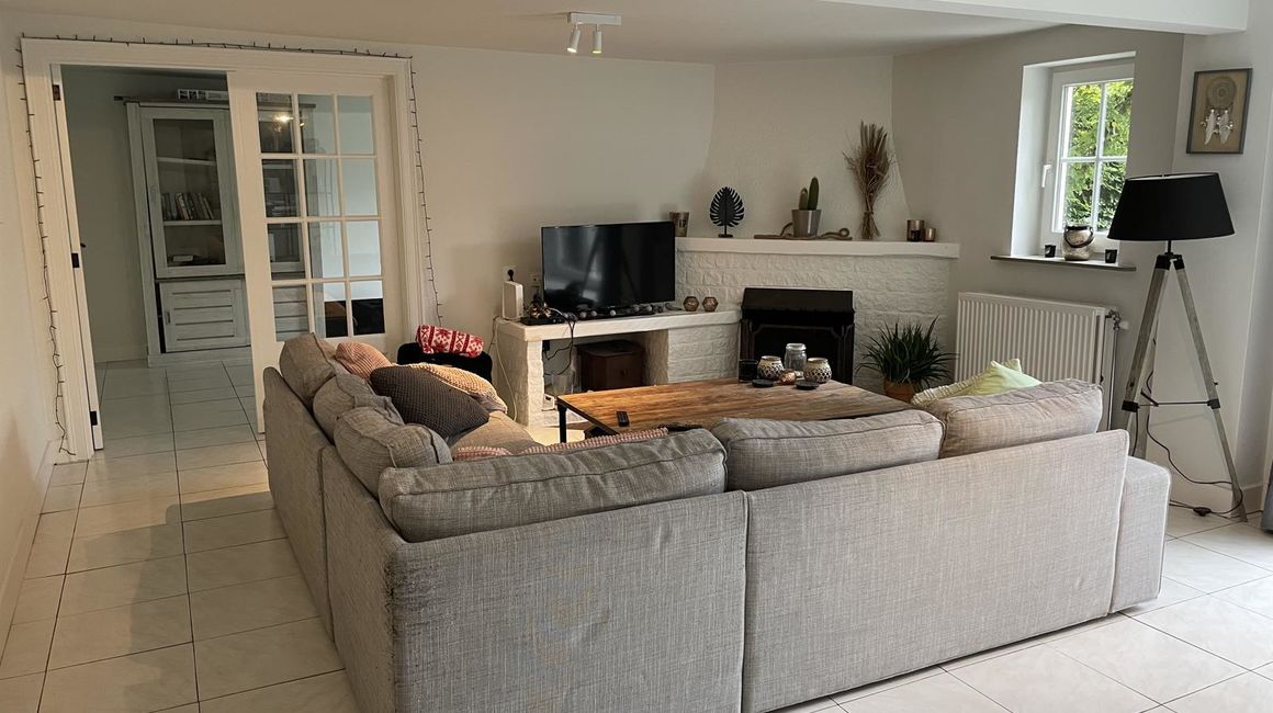 Inkomhal met toilet en vestiaire, L-vormige living met OH, volledig ingerichte keuken met wasplaats en proviandkamer, bureel.
